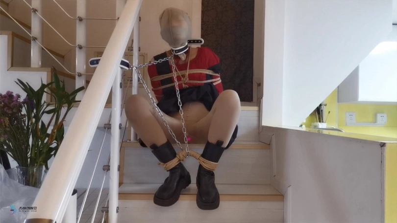 劫匪用脖套戴在她脖子上,另一头拴在栏杆上,把林洛固定在那里。嘴巴被胶带封住,并用丝袜套头。在她的下面放了一枚TD不断震着。琳洛被渐渐袭来的[X_X]刺激着,不断的呻吟。脱掉她的短靴,将她驷马捆绑在沙发上。连脚趾都没放过绑上,可爱的丝袜脚丫不断的扭动着。。。