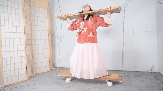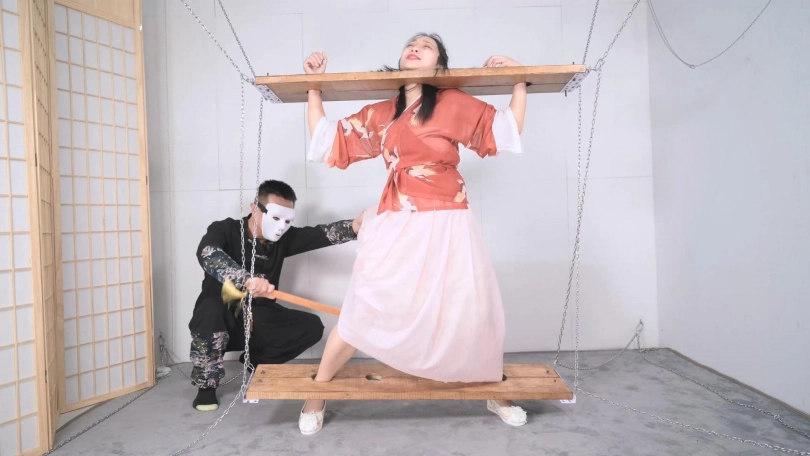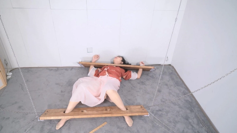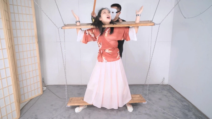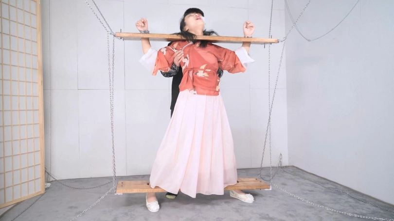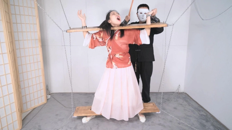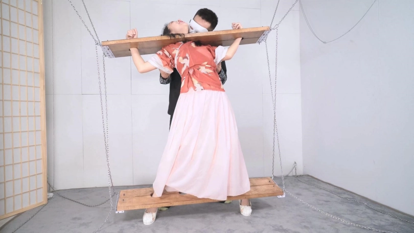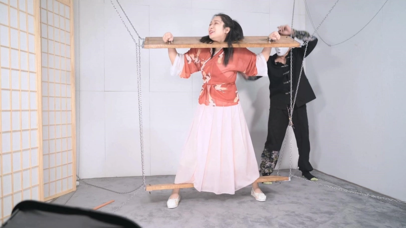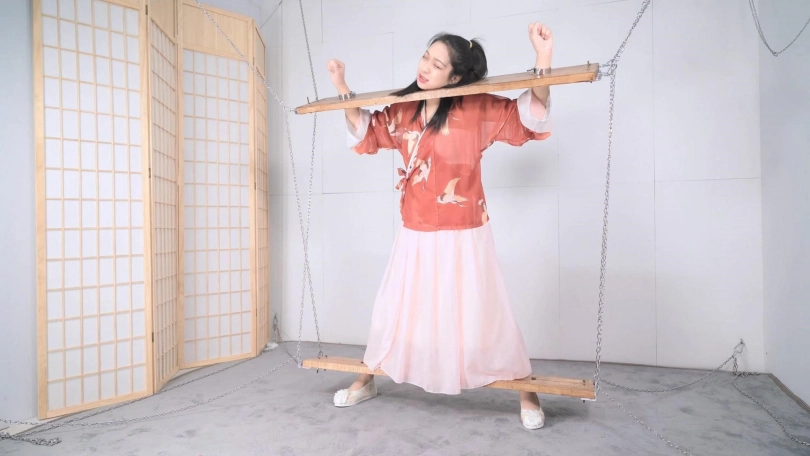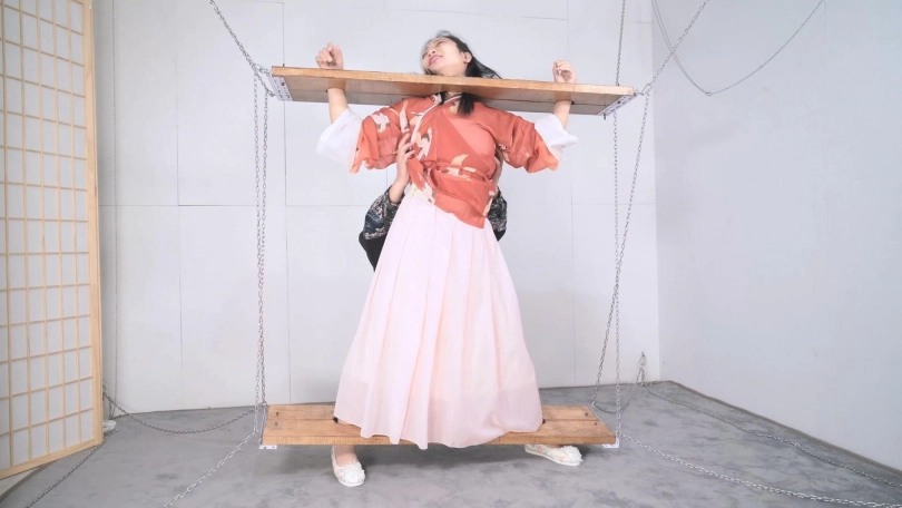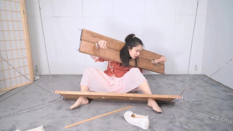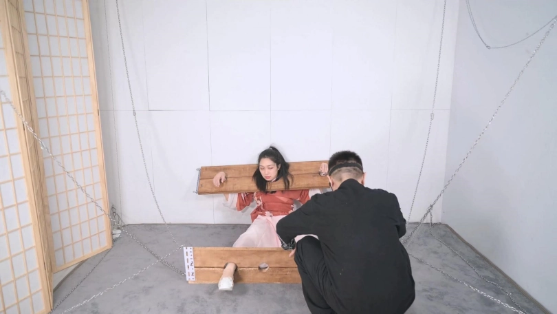这套古装好似有魔力一般,沐小雨穿上就像戏精附体,表演欲爆棚,我这老演员都差点没接住,微剧情有点意思,不做过多介绍。单说这木枷组合,头一次用铁链连接吊起,固定作用明显,还有足够活动空间,据说古代犯人带着木枷时间过长,能够被活活卡死,我不太相信!于是顺着她的剧情,把沐小雨和木枷一起解下来,还真让她找到了求生姿势,就不知道如果戴着我这套厚重木枷能坚持多久了。