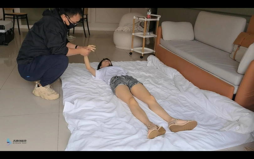 男主开门进来,拉起女孩的手看了看时间,说:“昏迷快一个小时了。今天太离谱了,骑车不小心撞晕了个妹子,看上去今天醒不过来了,不过看上去挺好看的,简直是完美的睡美人。”然后玩弄了一会她的手指,然后抬起女主的腿玩弄,并且玩弄了女主的脚,女主还是一动不动,男主又拽起女主的手把她拉起来使劲摇晃,女主还是没有反应。男主说:“多少年都没见过这样漂亮的女生了,趁着你昏迷,给你再拍几个照留个纪念”然后男主让女主瘫坐在沙发上,双脚都放在地上。(镜头给特写两分钟,并且有半分钟的脚部特写)然后男主又把女主放到地上平躺着。(镜头特写两分钟,半分钟脚部特写)然后男主让女主侧身倒在地上,就好像晕倒在地一样。(镜头给特写两分钟,并且有半分钟的脚部特写)然后男主让女主头朝下趴在地毯上。(镜头给特写两分钟,并且有半分钟的脚部特写)然后男主又把女主公主抱起来走了几圈(期间女主头无力后仰,镜头给女主的脸和双脚分别一次特写)然后男主把女主放回地毯上躺着。男主摇晃女主的身体,摆弄她的手和腿,做最后一次徒劳的尝试试图唤醒女主,可女主还是不省人事。男主就把女主双手十指相扣叠放在小腹,感叹道:“这妹子就算是昏迷中也这么美,可惜了估计见不到你清醒的样子。赶紧得帮你送走”随后把女主扛起来离去。