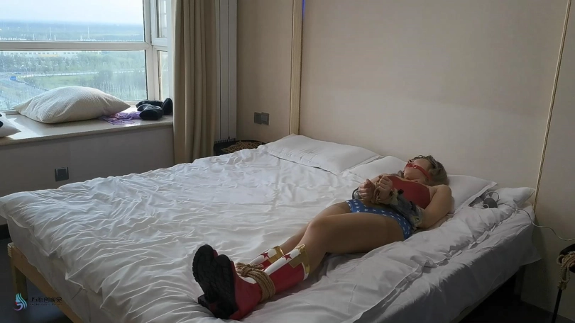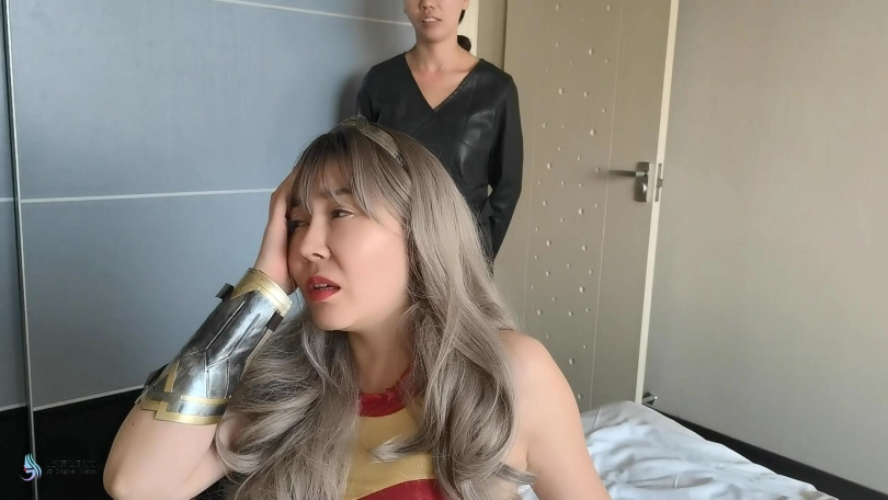 当神奇女侠醒来时发现自已已经被捆绑起来,嘴巴也被塞进口球。她惊慌的挣扎着。这时毒腾女和黑魔女走了进来,她们嘲笑着女侠,并脱去她的靴子。每人捧着女侠的一只脚,开始亲吻起来。随后她们一人在女侠身后抚摸她的胸部,一人在前面用棒棒刺激着女侠的Y部。神奇女侠发出放荡的呻吟声。。。