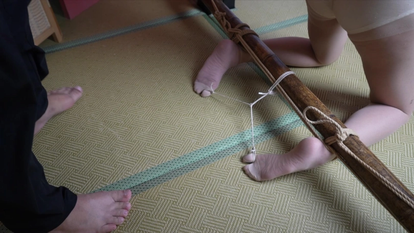 2.五花大绑以后,双脚分开绑在第一根竹竿上