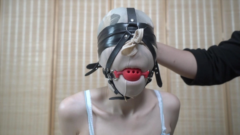 嗷嗷的面部用丝袜同样包住,最后戴上马具口球和鼻勾