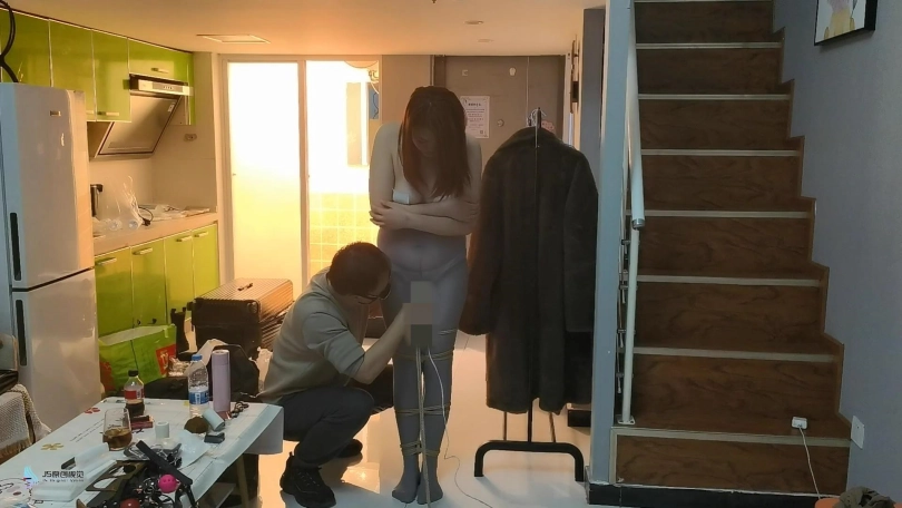 医生让女孩脱掉衣服,换上一双灰色丝袜。女孩的腿部被绳子一圈一圈的缠绕捆绑起来,双臂也扭到背后捆绑。用丝袜塞进女孩的嘴里,