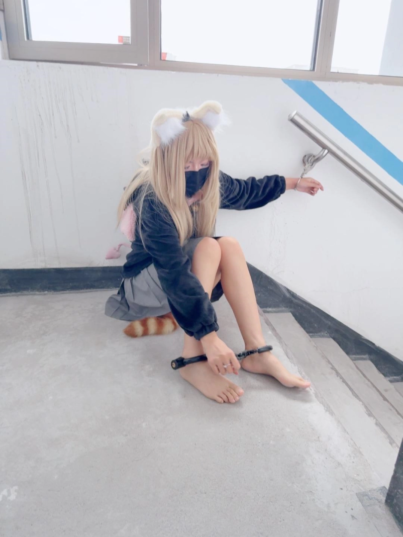 把赤脚裸足塞着[X_X]的小猫娘铐在小区楼梯间里!赤脚带着脚镣,一只手用手铐锁在楼梯间扶手上,逃跑不能,被迫在半公开的环境下被镣铐锁着!楼上有个送快递的大哥一直在扫包裹,楼下有个小哥在楼梯间抽烟~我们在中间紧张死了,一会一阵脚步声,一会一个咳嗽声....别说妹子了,我都有点心跳加速了!妹子更是特别着急,中间一直在尝试脱出镣铐~笨蛋,怎么可能脱的下来啦23333~