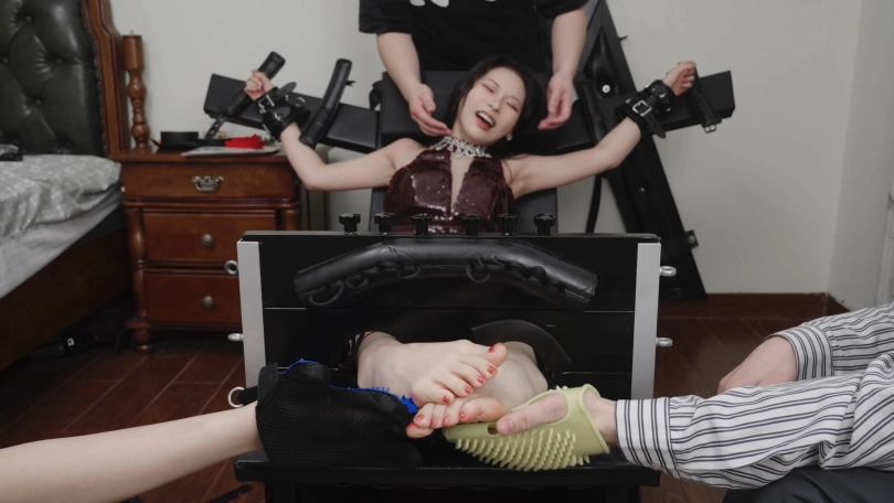 视频内容:随后我把艾米绑在束缚椅上面,她超怕痒所以很抗拒。