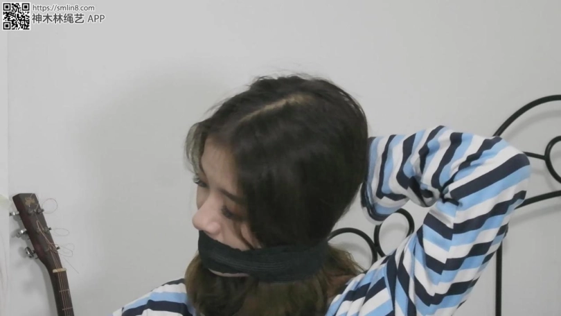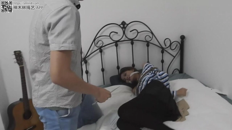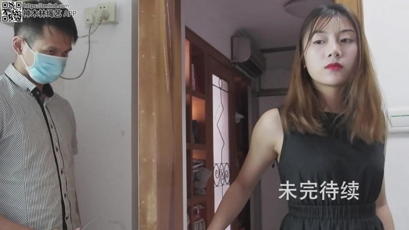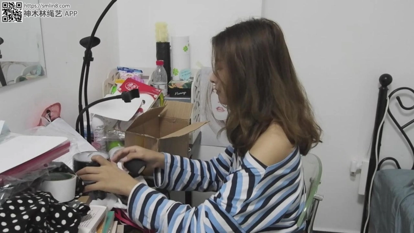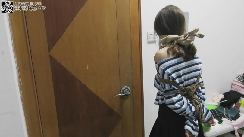 现在开始自缚,王娜按照要求用绳子将自己的大腿根先捆住,留着只能小碎步行走的距离。然后拆开薄丝袜,塞