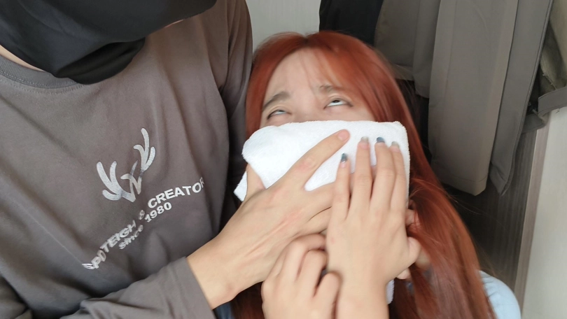 好利来美女店员娜娜下班回家后坐在椅子上玩手机,面具男溜进屋来突然从背后偷袭她,手帕捂到她嘴前,娜娜开始大声呼喊:“纳尼,纳尼,不是吧,雅蠛蝶、雅蠛蝶”之后被面具男反复捂晕玩弄身体,娜娜全程翻白眼挣扎但也无济于事,最终难逃魔爪。