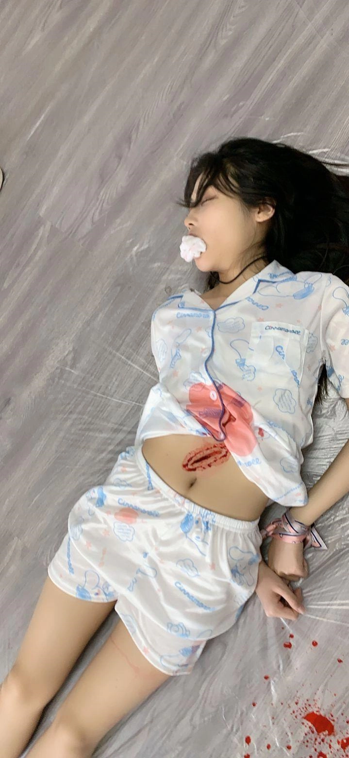 此时躺在地上的尸体姿势(两手被反绑在身后,脚脖被绑,嘴被堵着。上衣由于拖拽露出一小部分腹部及肚子上的刀口)留 2 分钟。