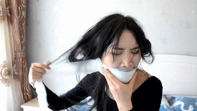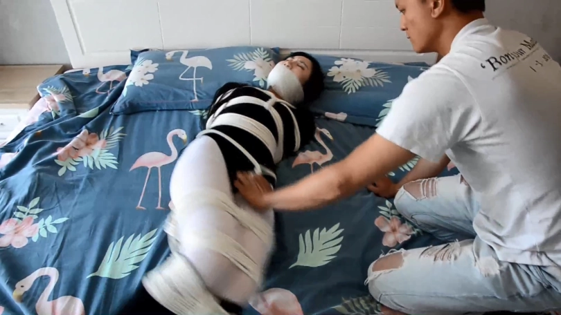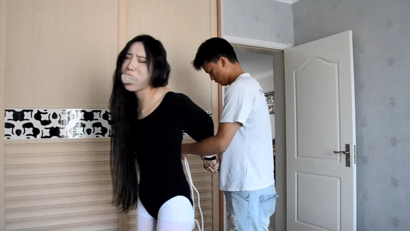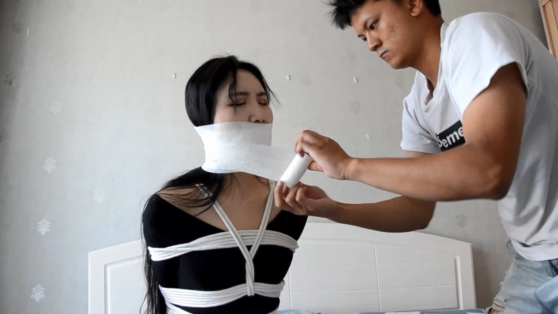快递员把MM拉进房间,准备把MM捆绑起来。 为了不让MM吐出口中的裤袜,快递员往MM的嘴贴上了6块银色的胶布,直到MM的整个脸部、嘴巴和下巴变成了银色一片。快递员再用绷带把MM的嘴绕了8圈,MM诱人的「呜呜」已经小了很多。
