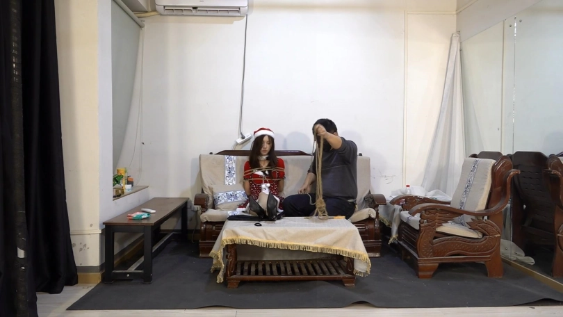 甘然小姐姐穿上了漂亮的圣诞服饰,脚穿黑色高跟鞋被驷马捆绑起来。她奋力挣扎,挣脱束缚,换来的却是更严密的驷马捆绑。甘然后半部分的挣扎与呻吟十分卖力真实。