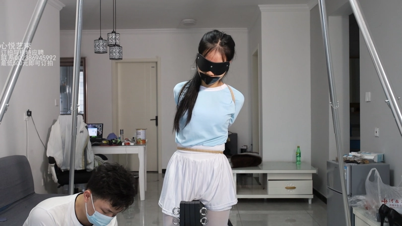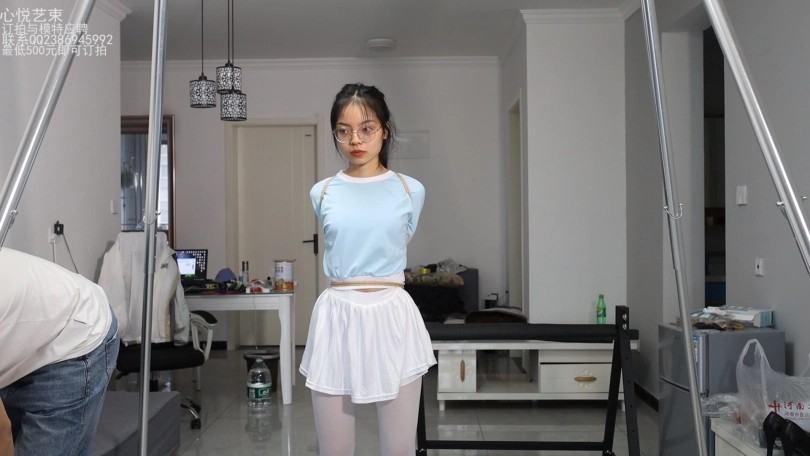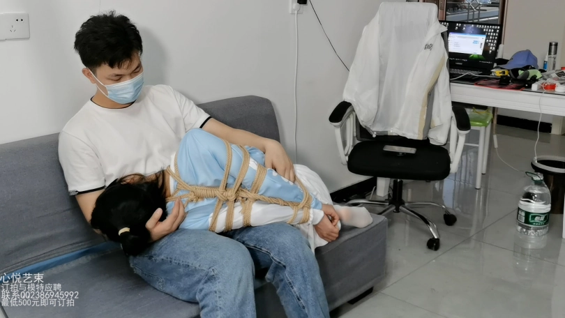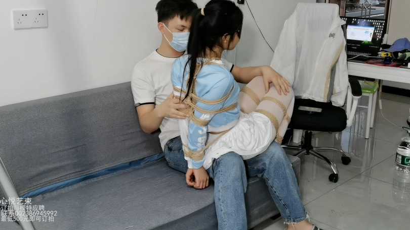 给妹子尝试一下震动之类的小玩具用起来感觉怎么样,所以没有太过较真的去强制,一开始我是想吊起来M字绑在木马上面的,但是好像操作起来很困难,只好退而求其次,绑成欧式和M字绑脚。妹子第一次接触震动的玩具,反应有点可爱。