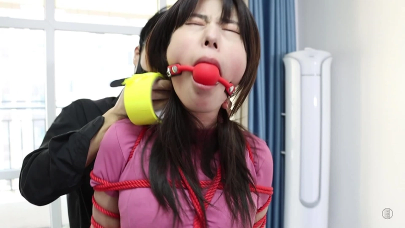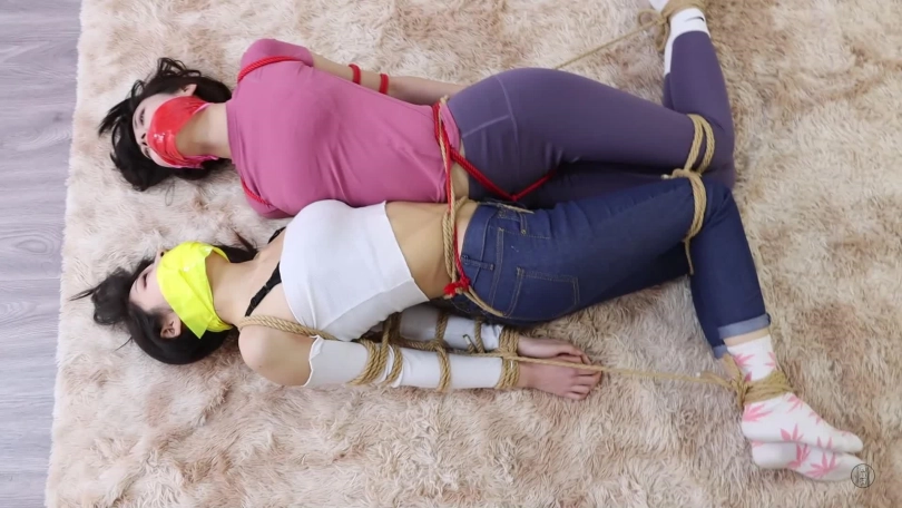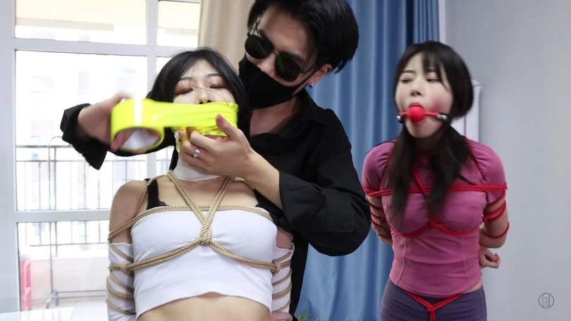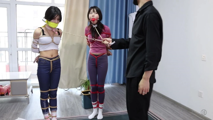 第二天,男主一觉醒来伸了个懒腰,睡得真香,可两个美女可就苦了,被折腾一晚上,累得睡着了,得男主使劲地拍照才把她俩弄醒,弄醒后男主可不会放过她俩,觉得她俩都不是好东西,打算跟他们换个日式勒胸缚,捆绑脚的蛇缚,就这个姿势下,二女只得跳来跳去,男主想到了好主意,给二人带上项圈和链子然后牵着他们,让他们蹦哒几圈。当然蹦哒还不尽兴,还得不同方式严厉堵嘴,让她们边跳边发出呜呜呜声音。就这样,男主先把一张餐巾纸塞到小三嘴巴里,再给她带上红色口球,这小嘴别提多性感。堵好小三嘴后,男主拿来双黄白厚棉袜,就把它们塞到原配嘴里,把原配嘴巴撑得满满的,然后贴上透明胶带,外面用黄色绷带缠绕封上,就这样,二女被堵好嘴,任由男主牵着蹦跳还只能发出呜呜呜声。崩了好一会,二女累得不行了,这个姿势,男主也玩累了,就给他们换了姿势,镜头一转,两女强制抬头加驷马连缚(如图),捆绑完后,二女骂着男主混蛋,渣男等,男主气了,就用绿色袜子堵住小三的嘴巴,然后用粉色绷带缠绕封上红色胶带缠绕封上,而原配呢,则被黄白麻叶棉袜堵嘴,而后橙色蹦带缠绕封上用黄色胶带缠绕封上,捆绑堵嘴完后,男主离开,留二女地上挣扎并含糊不清的互相指责对方呜呜呜。(这部剧的堵嘴封嘴严厉且细节到位,蹦跳和放置挣扎不错,可以说是堵嘴和挣扎爱好者的福利)