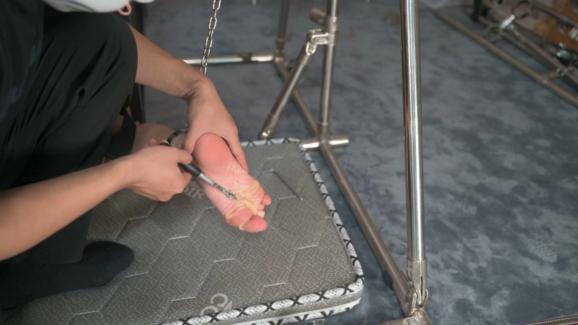 绳师这次下手挺狠,手臂反扭固定确保上半身几乎不能动,把脚腕吊起离地,她就只能小腿能动了,这次用了两种威力比较大的电击器,特别喜欢看她被电时扭动胳膊和身体的样子,而且这次持续时间也比较长,她一直挣扎,最后快精疲力尽的时候才停把遥控电击器停下来。