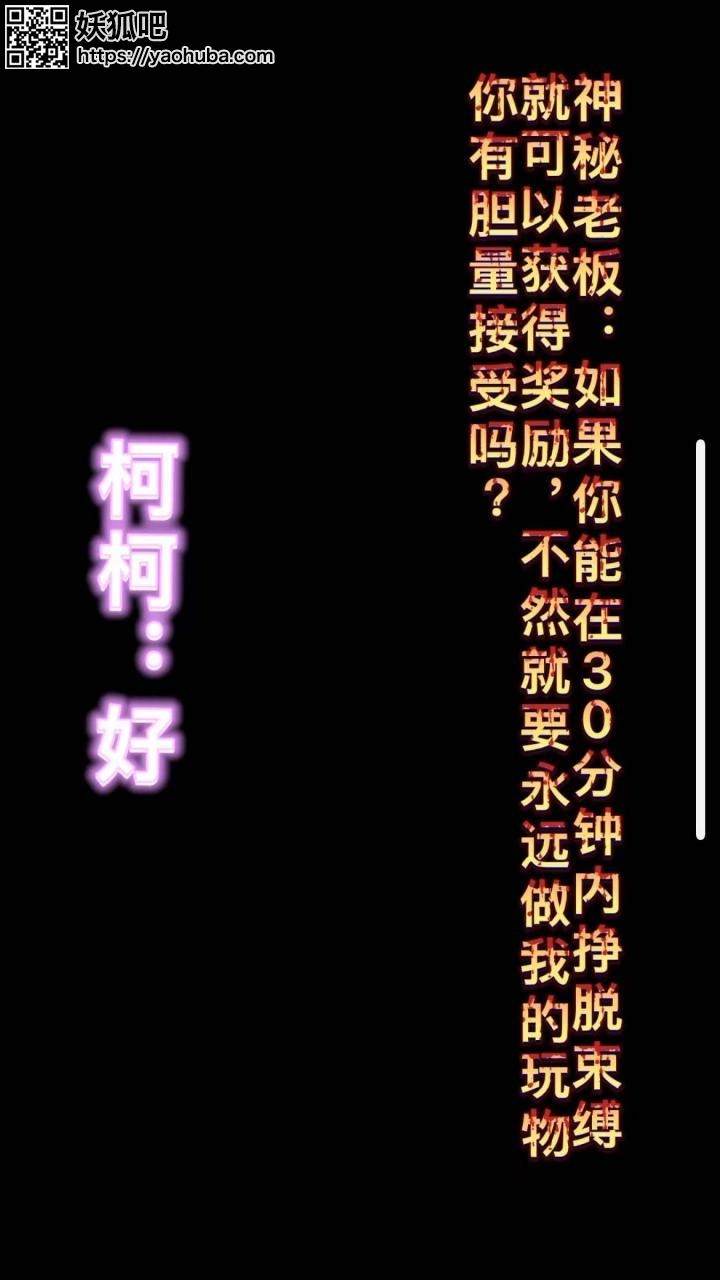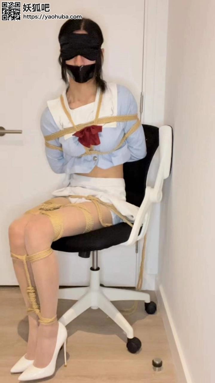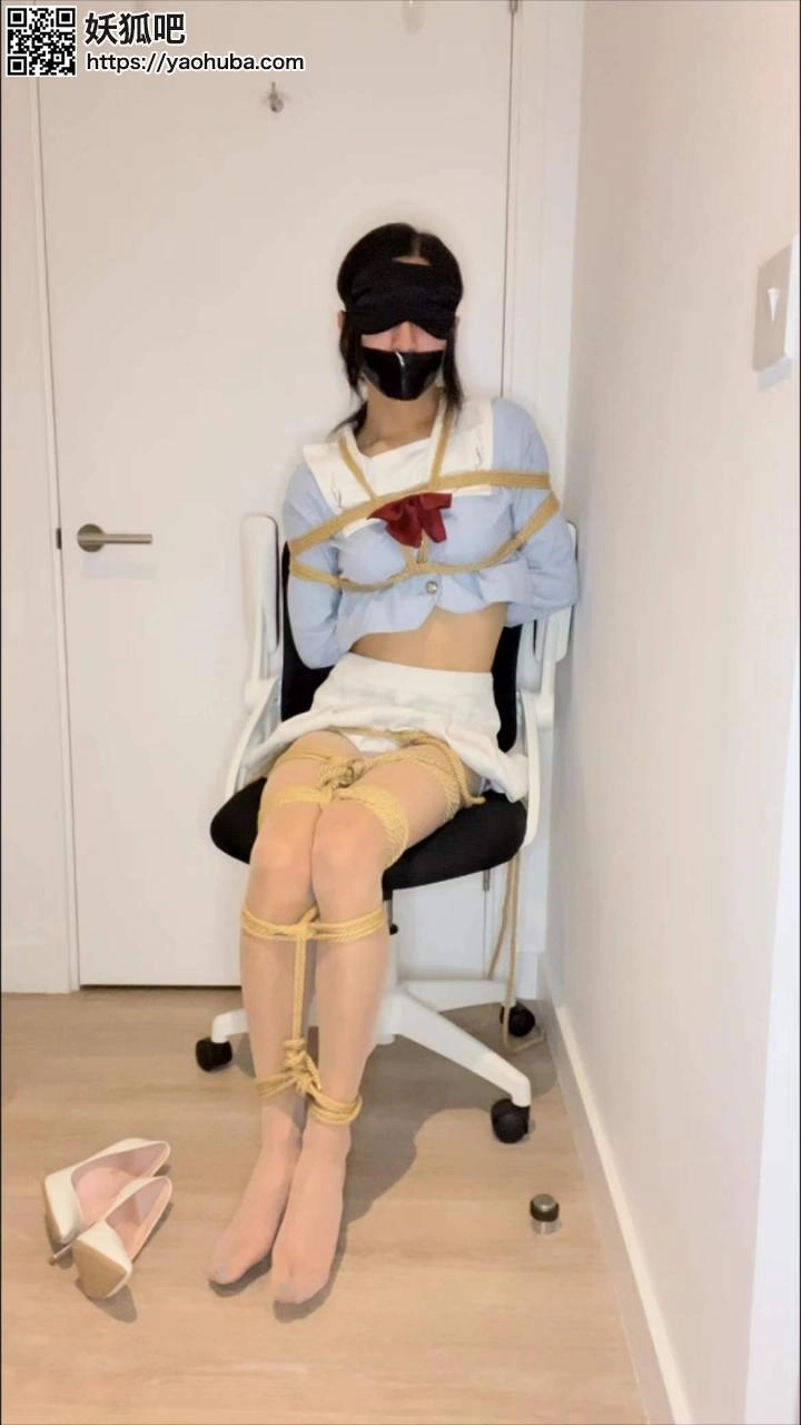 柯柯收到了神秘老板的逃脱魔术邀请。柯柯首先把自己上半身绑起来。腿部并拢绑在一起脚踝也绑几道,然后用绳子把自己绑在椅子上,嘴用丝袜堵住,再贴上胶带,戴上眼罩。可惜柯柯没有在规定时间内逃脱,神秘人决定再给柯柯一次机会,一阵眩晕过后柯柯被迫换上了OL制服和短裙,双手被分别绑在椅子把手上,腿部强制翘起二郎腿并在大腿上捆绑几道,双脚被分开绑在两边的椅子腿上。同样嘴里塞满丝袜并用胶带封口,眼睛也被蒙住。对了,还有柯柯身上的菱缚!柯柯又开始了挣扎逃脱,可惜最后还是没有逃脱成功,沦为了神秘老板的玩物...