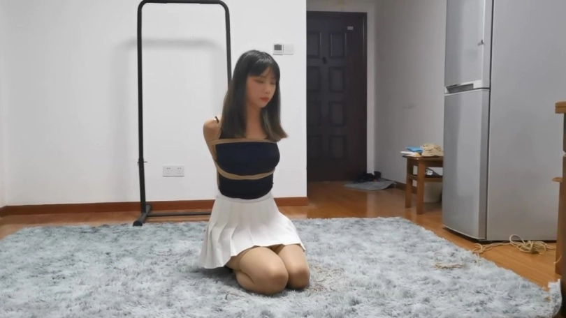 2.模特用装有一把钥匙的短丝袜塞嘴,然后用普通口球勒紧在丝袜外边,上身后手观音驷马捆绑,并胶带蒙眼,在地毯上随机位置再丢一把钥匙。目标在10分钟时间内用手拿到两把钥匙。