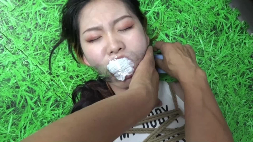 美女在家中锻炼,心想让私人教练上门指导i,哪里知道自己已经被健身教练定上了,她打电话给教练,一会教练来到了,也带来了刀子和绳子。将她挟持摁倒并捆绑起来,上半身自臂缚,捆绑腿脚时,美女乱踢,教练一气之下,摁住她的双脚,然后打她的屁股,命令她老实点,美女迫于无奈只好老实,乖乖听话,这时教练脱了她的鞋子,挠她脚心,美女腿开始乱踢,教练只好用力摁住,然后用绳子把膝盖,脚腕紧紧捆绑,这下美女彻底老实了,教练捆绑完她后,进屋搜寻财物了,留美女在地上挣扎想要解开绳子。一会教练来了,将美女扶起来,再让她跪下,然后用刀子和银行卡狂拍美女的脸,逼她说出银行卡密码,美女屈服了只好说密码并求教练放过她,可教练知道后,哪里会放过她,又用绳子把她从新捆绑,上半身五花大绑,下半身捆股绳,膝盖,脚腕,捆绑完毕后又用白袜子塞到她的嘴巴里,然后外面用透明胶带缠绕封上,美女只能发出呜呜呜的声音,堵完嘴巴后,教练觉得捆绑还不够,怕美女跑了,又将她超级紧的驷马倒攒蹄绑起来。这下美女挣扎得很难受,只能上下翻身和发出呜呜呜声音。