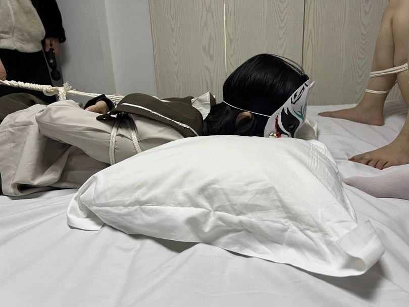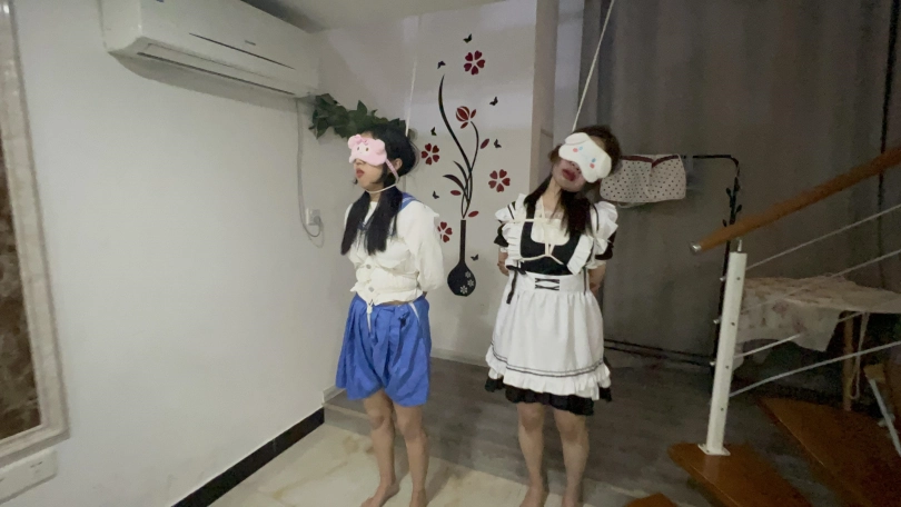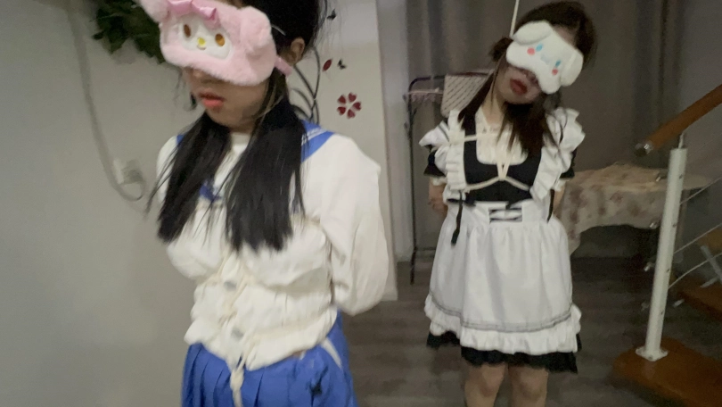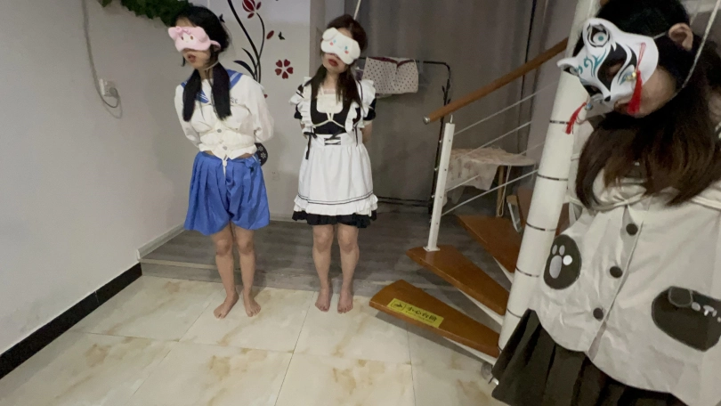 三位少女乐意接受绞刑处理,但毕竟年级还小还些不安,于是带上眼罩接受捆绑。