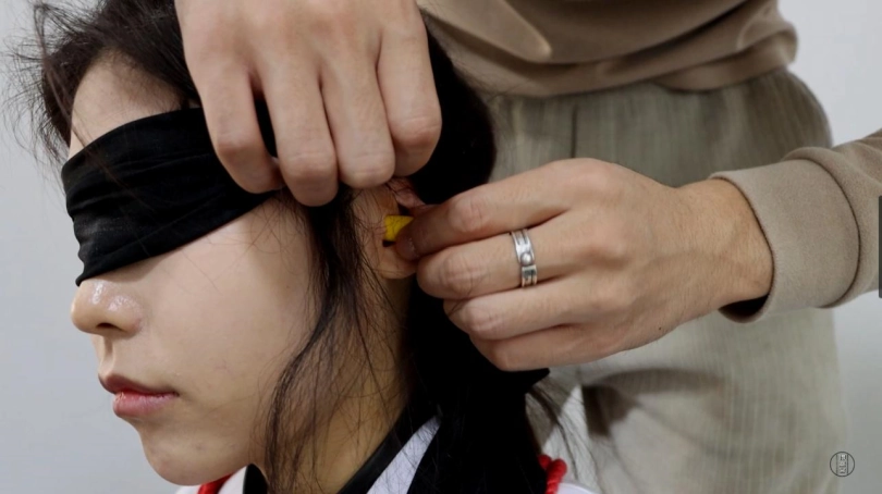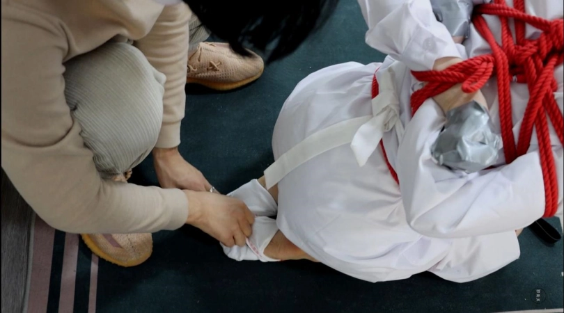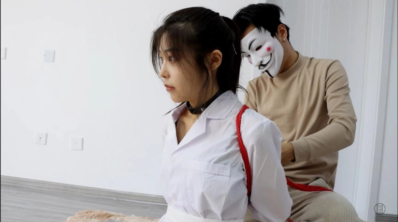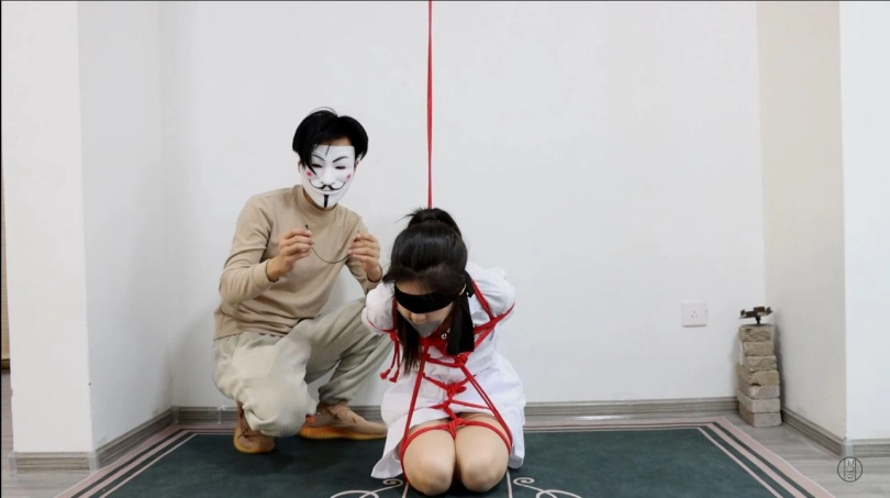 双手攥拳被胶带裹住,双手反剪后被红绳绑在身后,双腿也被并拢绑在一起,一步一步的束缚让米娅体验到了逐渐丧失活动能力的无助感,同时自己还需要配合捆绑,更加令她感到羞耻。