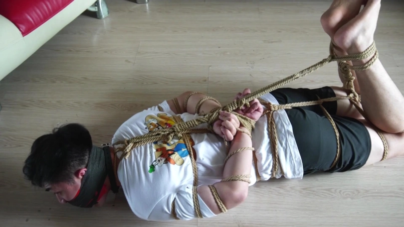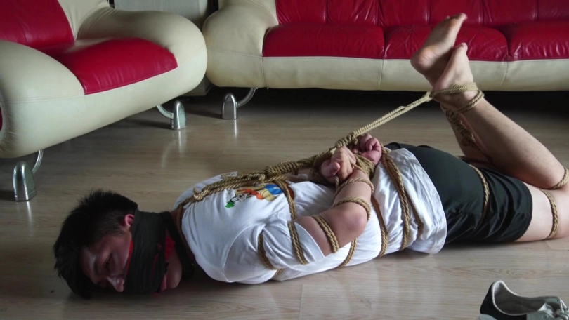 女劫匪将帅哥双腿和脚踝捆好,去帅哥家里继续翻找财物,帅哥坐在地上扭动身体挣扎,挣扎了半天总算弄开上身捆绳,给双腿脚踝捆绳解开,打算拽出嘴里两只锦纶丝袜。