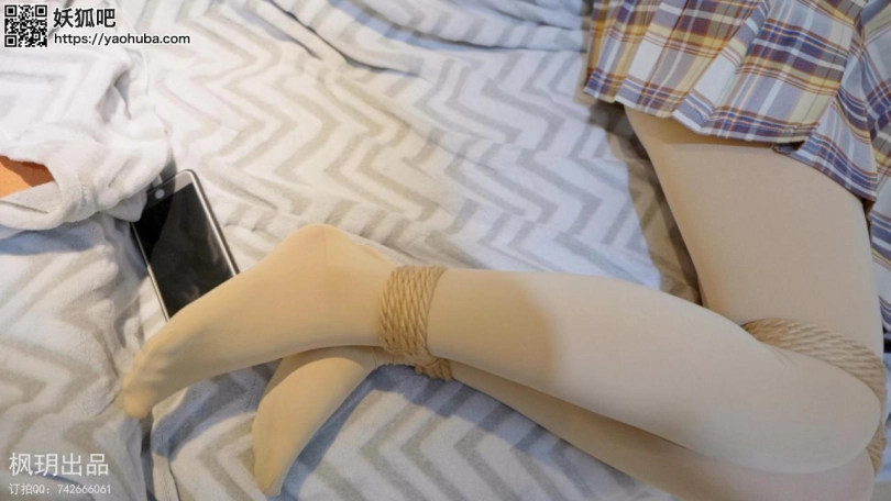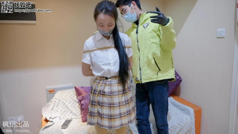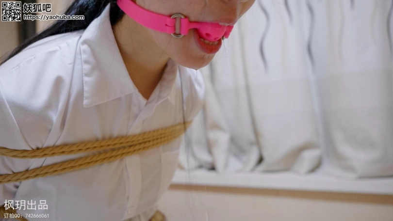 模特枫玥下班回家后就躺在沙发玩手机,突然接到了高利贷的催还款电话,但是没有钱,于是便说完没钱就直接挂断电话了,过一会有人敲门于是便去开门,一开门就被歹徒用毛巾捂住嘴拖到逼迫脱下黑丝换上光腿袜,换上后用脱下的黑丝堵住嘴,然后捆绑好手脚,歹徒便离开了,模特枫玥看见歹徒离开后便想要逃跑可是被歹徒抓个正着被拖到床上绑上驷马,要挟模特枫玥要是能说出钱财位置就能放了他,于是便带歹徒到放钱财的柜子并说出了密码,不料歹徒反悔了,拿了水给模特枫玥喝一口就用口球紧紧塞住嘴,然后紧紧捆好,最后还换上一个大口球放置离开了。 视频结尾是模特对本次拍摄被绑后的感受和两种口球的舒适感和口水效果的总结