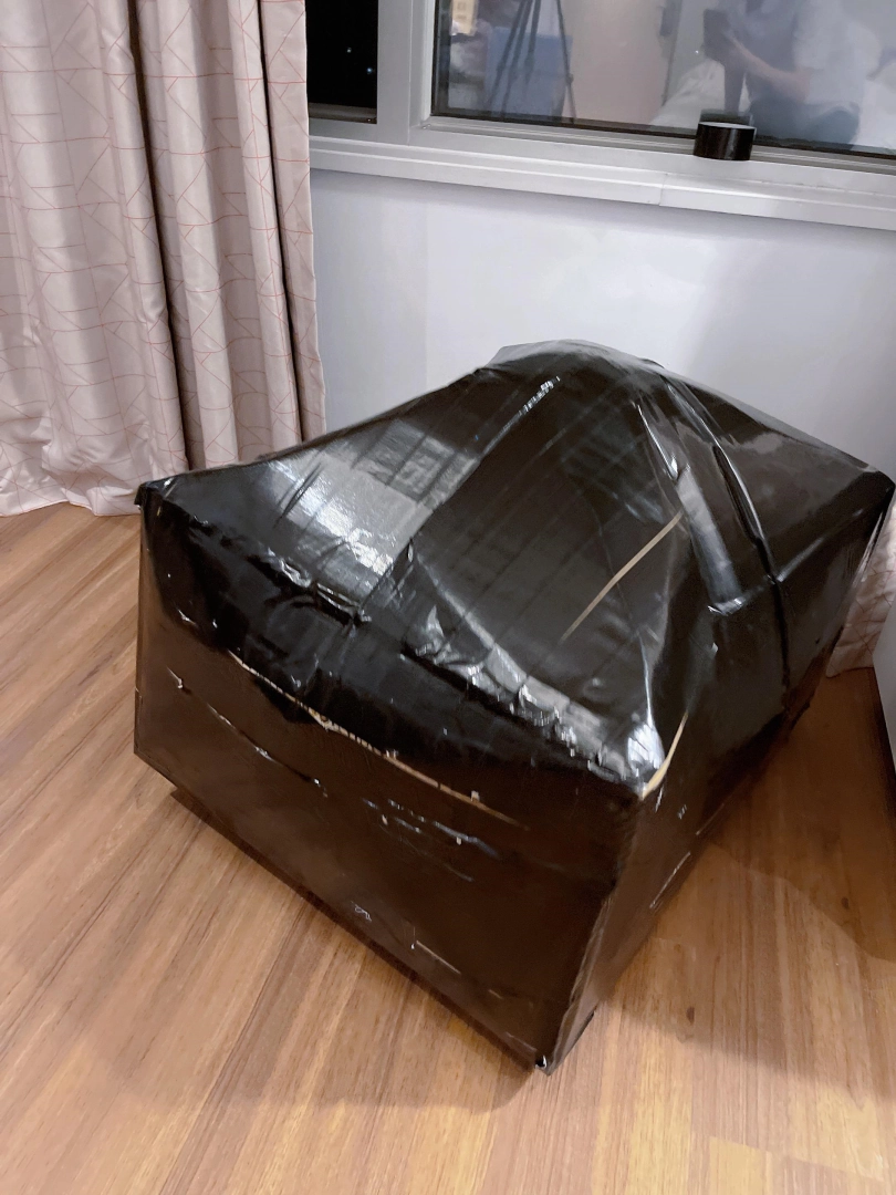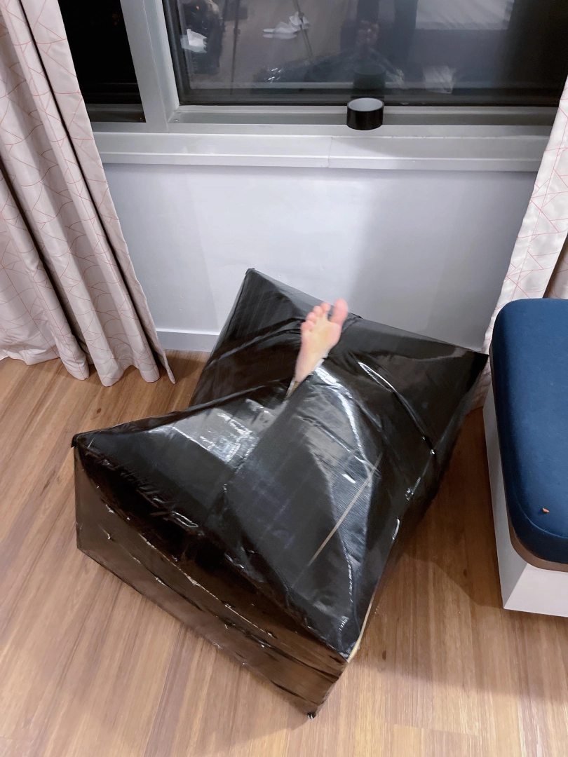 茶茶好像一直很喜欢物品化、封闭的play,今天也给茶茶弄个封闭装箱体验。