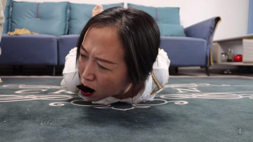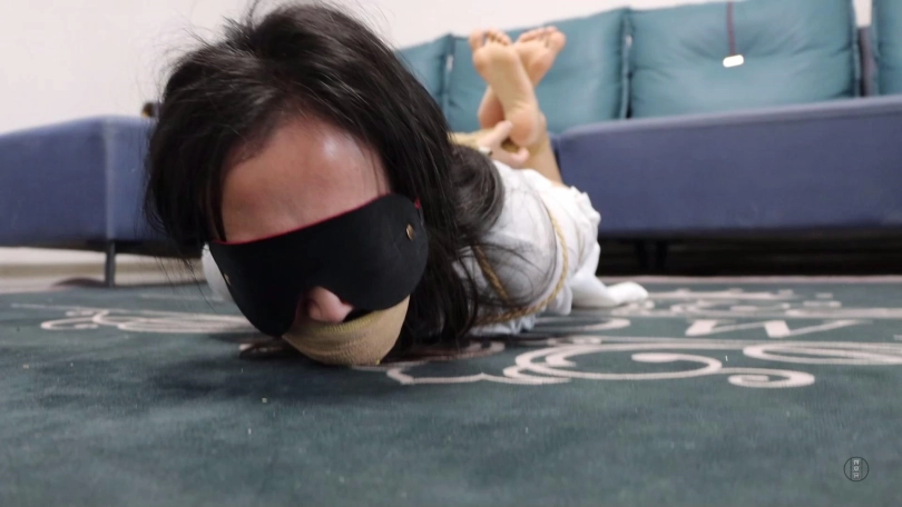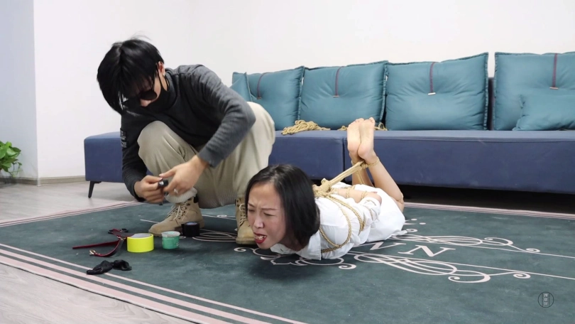 劫匪将文清上身五花大绑,双腿脚踝重新并拢捆绑好,并在此基础上捆成驷马姿势放置在沙发前地上。