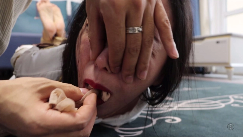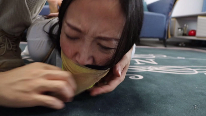 为了惩罚文清之前想跑,劫匪扒掉文清脚上穿的一双肉色短丝袜,拽出文清口中黑色短丝袜丢掉后捏住文清鼻子强行把这两只原味肉色短丝袜塞到文清口中,并拿黑色宽胶布剪下5张封在文清嘴外,用黄色胶带缠绕多圈,最后用肤色弹力自粘绷带缠绕多圈封严实。