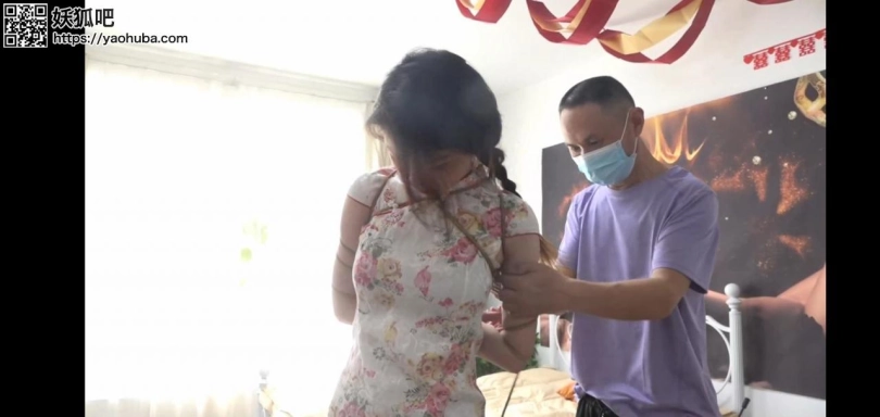 这个时候车主回来了,打开客厅大门,瞬间傻眼了,这是什么情况?客厅中央居然摆放着一名被紧紧捆绑的女子,身穿ok制服装,一双修长的美腿穿着肉丝丝袜被紧紧捆绑在一起,上半身也被绳索复杂的捆绑起来。嘴里塞着口塞戴着眼罩,正无助的挣扎着。突然觉得似乎有些眼熟,走进一看,诶!这不是4s店的女销售员嘛!这时手机收到一条信息,车主一看这才明白是怎么回事。接着走到柳洋面前说:“被捆的这么辛苦,让我替你松绑吧!”解开绳索的柳洋还没缓过神来,车主便拿出一套旗袍一双白色长筒丝袜说:“既然是店里的特殊服务,那就陪你玩一下吧,来把这套衣服换上。”很快柳洋就把旗袍换上,穿着白色长筒丝袜站在客厅。车主看着眼前的柳洋十分满意,拿出一捆绳子在柳洋的玉臂上缠绕几圈,抓着双手扭到背后,很快就被五花捆绑起来。紧接着让柳洋坐了下来,将大腿与小腿折叠捆绑在一起,之后扶着她趴在地上,拿出一根绳子,穿过背后的绳索,绕到穿着高跟鞋的美脚上,用力一拉,柳洋的上半身不得不高高挺起,将她驷马捆绑起来。由于被绳索一拉,似乎有些难受,柳洋不由得大叫一声说:“你就不能轻点嘛,弄疼我了。”车主说:“被捆上了还不老实是吧。”接着拿出一双肉色丝袜准备塞入柳洋嘴中。柳洋看着手中的丝袜拼命反抗说:“不要,没说要塞丝袜,我们没这种服务。”车主:“没这种服务,被捆成这样你还能反抗嘛!”柳洋紧闭着嘴巴不肯张嘴。车主捏着柳洋的鼻孔,柳洋不得不张开自己的樱桃小嘴,丝袜被一点一点的塞入嘴中,为了防止柳洋将丝袜顶出口中,在为她贴上一片胶布。男子看着犹如一件艺术品般被捆绑起来的柳洋,随后坐在一旁慢慢欣赏着自己的杰作~