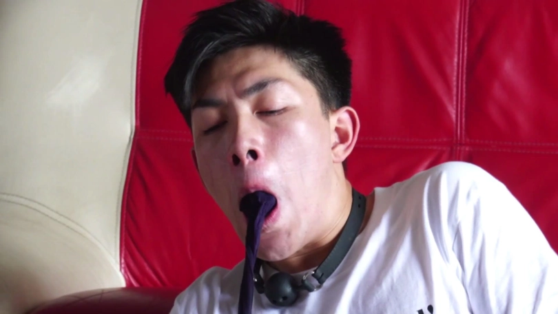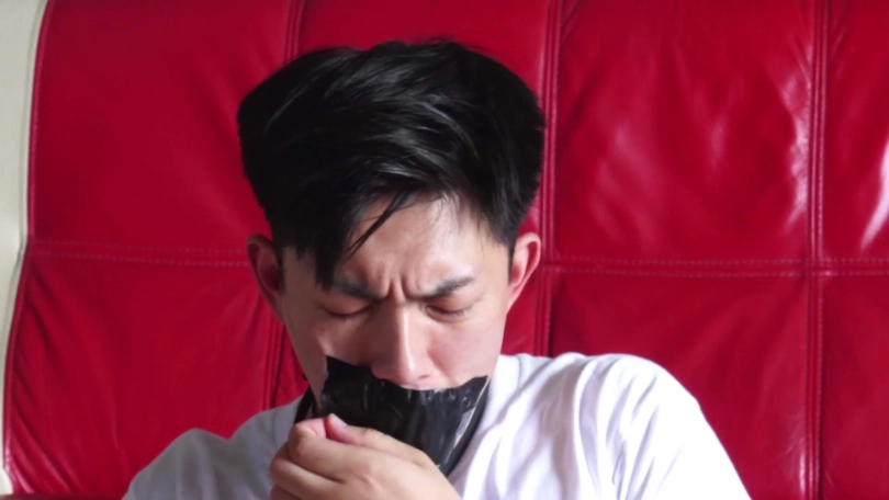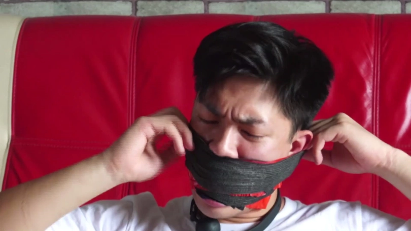 (三)与表哥玩打赌捆绑塞嘴游戏反而被表哥欺骗捆堵更紧的一一在长时间挣扎后终于挣脱束缚,撕掉嘴外白色自粘绷带、黑色宽胶带和黑色胶布,拽出口中表哥穿了好几天没洗的臭锦纶丝袜,厌恶地咒骂着欺骗自己的表哥。