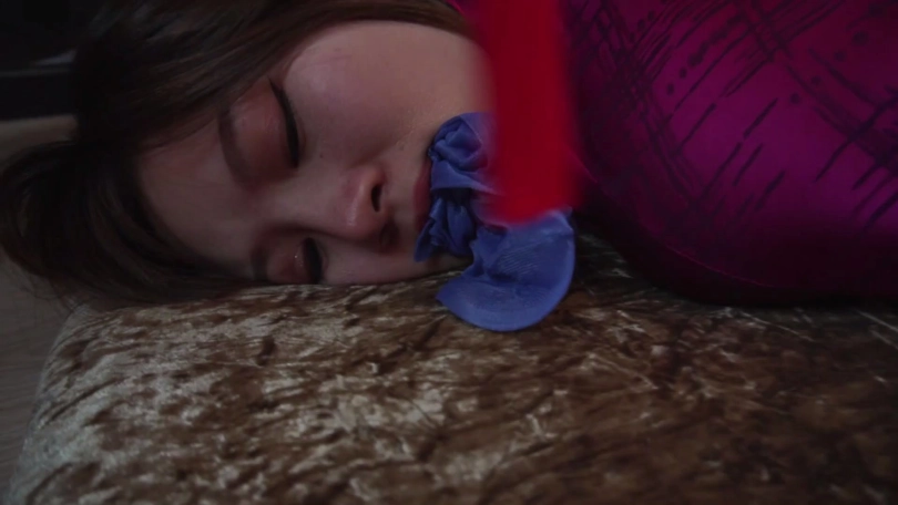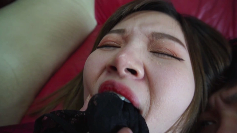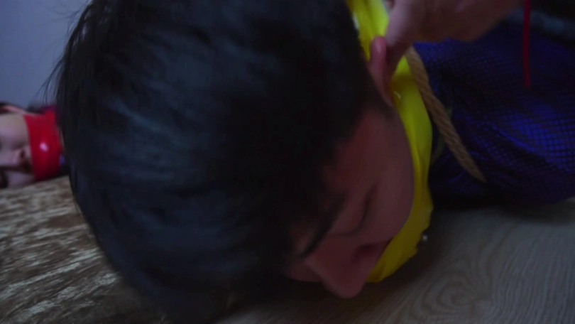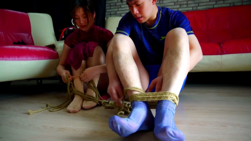劫匪将男女情侣二人上身五花大绑,双腿脚踝并拢捆绑多道,并在此基础上将二人驷马捆绑放置,分别扒掉二人脚上穿的一双肉色锦纶丝袜和深蓝色锦纶丝袜交换塞入二人口中,令情侣二人苦不堪言,接着,劫匪用红色胶带、黄色胶带、黑色自粘绷带缠绕封嘴,令情侣二人只能发出微弱沉闷的呜呜声。