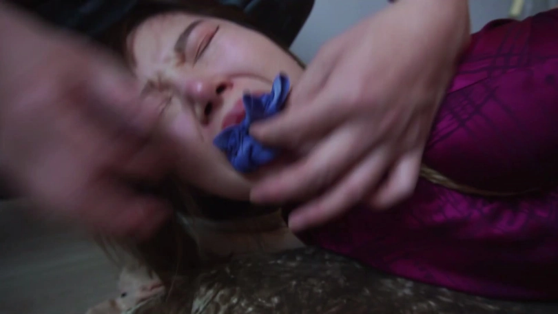 劫匪给二人拍了几张照片,还故意拿给他们看加以羞辱,愤怒的情侣二人瞪向劫匪,劫匪遂用黄色胶带和黑色自粘绷带缠绕封眼,为了报复女模特小琛还恶作剧般去挠她的脚面,令她不断愤怒地发出呜呜呜闷哼声。