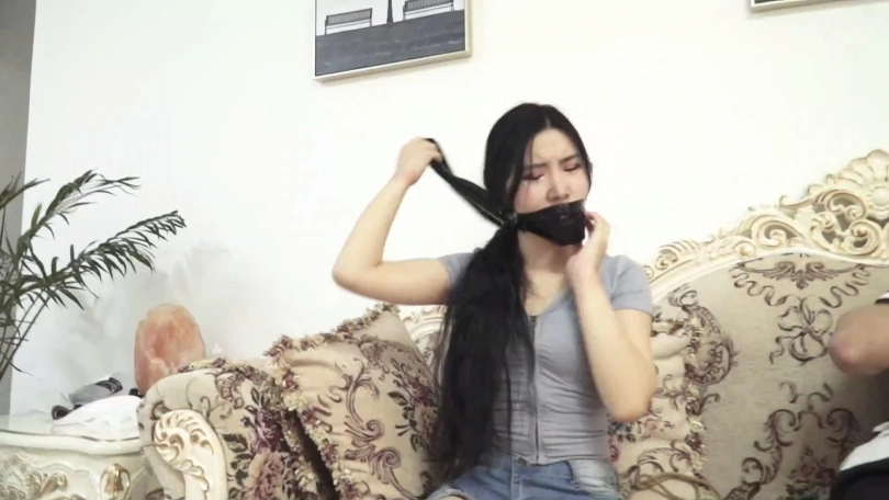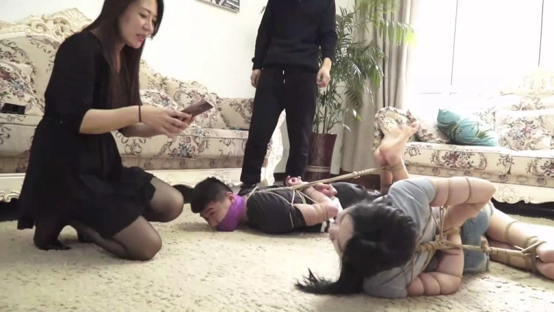 李然和丈夫锁哥提议给吴晗和她男友留个纪念,于是这对雌雄大盗当着情侣二人的面分别脱掉腿上穿的一条黑色连裤丝袜和一双灰色锦纶丝袜,分别将锁哥的锦纶丝袜塞入吴晗口中,将李然的原味黑色裤袜塞入吴晗男友口中,令情侣苦不堪言。