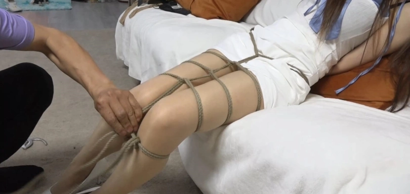 这天柳洋被戴好手铐脚铐关在房间里,她也不知道等待她的将会是什么。被戴着手铐的手腕被金属割的十分的疼痛,正不时的挣扎着。这时调查人员走了进来。柳洋看到调查人员进来,虽然知道那是不可能的,还是愤怒的说:“你要干什么赶紧把我放了。”调查人员:“柳小姐,对你的关押命令已经下达了,现在我要对你实行关押。”说完拿出一根手帕捂在了柳洋的脸上,柳洋奋力的挣扎着,奈何手上戴着手铐,男子的力气实在太大了,很快便觉得脑袋有些晕乎乎的,便昏迷过去。调查人员随即将她的脚铐打开,用着绳索将他的双腿并拢捆绑在一起,无法分开,接着拿出一双丝袜缓缓塞入柳洋的嘴中。昏迷的柳洋被塞入丝袜,不禁发出一丝呻吟,为了防止吐出丝袜,调查人员用着一块胶布贴在了柳洋的嘴上,这样不管如何挣扎,都无法将嘴里的丝袜吐出来。戴上眼罩再次用一根绳索将柳洋驷马捆绑起来。很快柳洋便醒了过来,戴着眼罩处于一片黑暗之中,可以感觉到自己手脚都被捆绑起来,处于一种驷马捆绑的姿势,而自己的嘴里充满了丝质的填充物看来自己的嘴也被堵了起来,处于黑暗之中的她也无法知道自己身在何处。不知过了多久,柳洋感觉到有人靠近,突然一阵强光射入眼中。柳洋脸上的眼罩被摘了下来,只是眼前的人并不是调查自己的调查人员,而是当初自己找到绳艺会所的老板。此时的柳洋身上的绳索已经被完全解开,她身边坐着的便是会所的老板,而老板也是对柳洋说明了原因。一切终于真相大白,原来这是会所为了让自己的客户真正体验到那种被监禁的感觉,为了保持神秘感在客户不知情的情况下安排的一场游戏。而柳洋回想起这几天的监禁拷问,这几天发生的事情犹如一场梦境一般。自己恢复了自由,仿佛什么也没有发生,当真是一场游戏一场梦啊!而柳洋在跟会所老板交流了一会之后,对于自己这场监禁体验也到此结束。柳洋非常有礼貌的跟老板说了声再见,也仿佛是在跟各位观众说着这部剧本也是到此完结!那我们就下个剧本见吧~