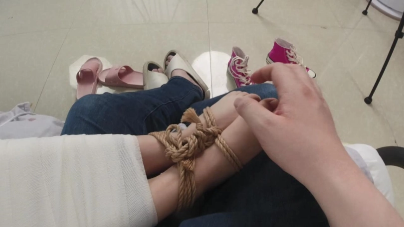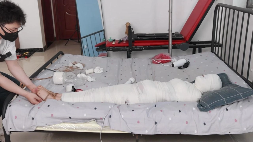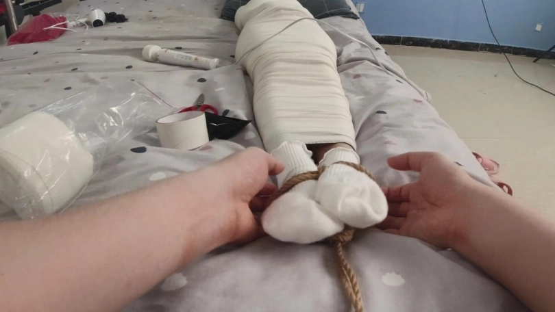 被抓回来的女孩被胶带缠绕数道,又被袜子堵嘴外面用胶带紧紧缠绕,再用绷带全包露出脚丫,疯狂挠痒痒。