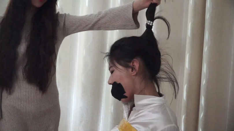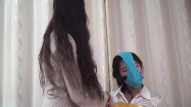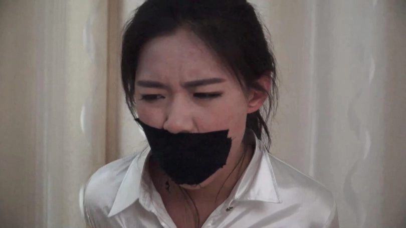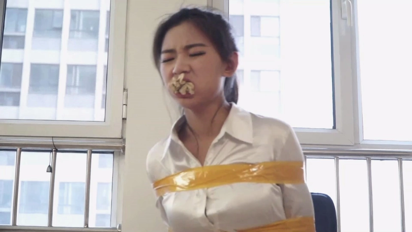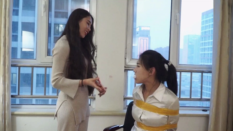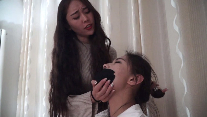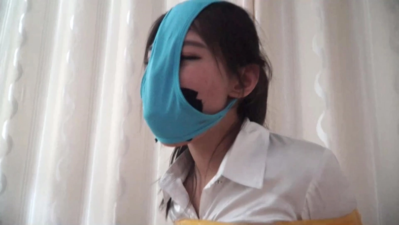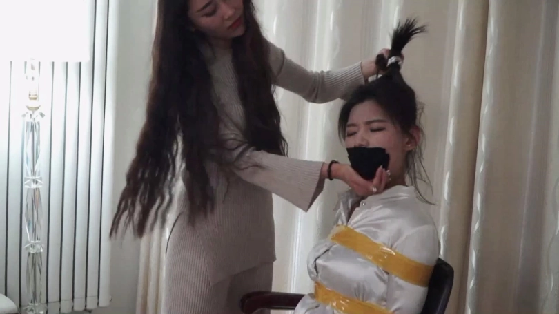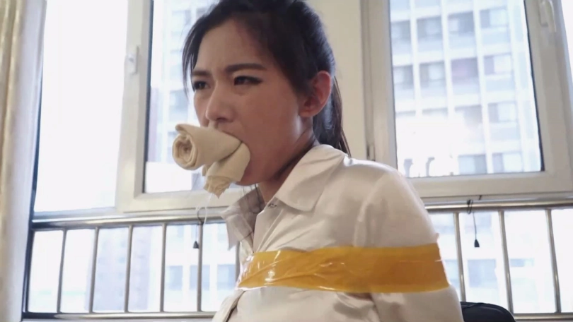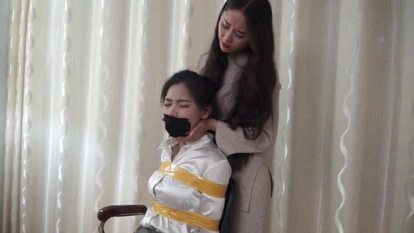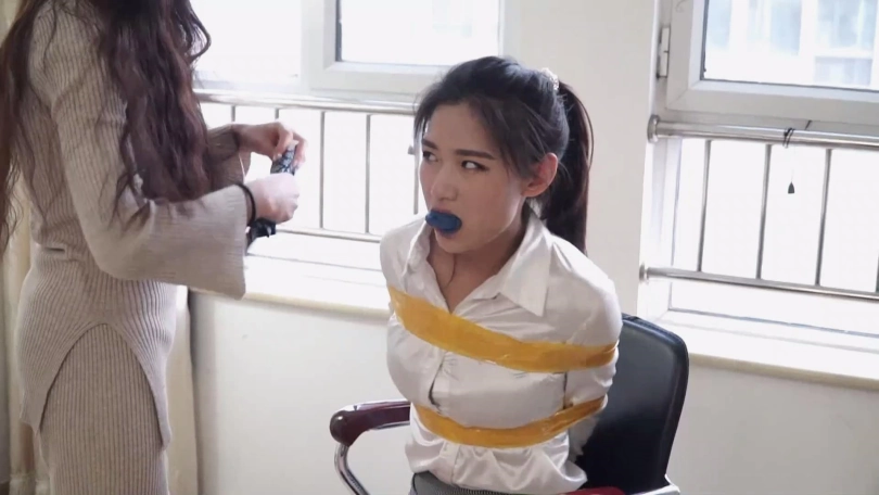 邢嘉妮有事要出去,临走前最后一次堵好罗薇薇嘴巴后拿黑色宽布制胶带封在罗薇薇嘴上,并把自己一条原味脏内裤套在罗薇薇头上后扬长而去,留下罗薇薇坐在椅子上呜呜呜忍受着脏内裤气味羞辱闷哼挣扎着。
