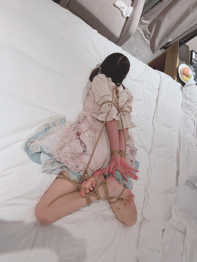 既然是紧缚,手指脚趾又怎么能放过呢?用两根绳子分别做一个折腿缚,再把折叠起来的双腿用盘腿缚的姿势绑起来,最后把脚腕茶茶分别固定在背后直臂的绳子上,然后用绳子把大拇指也捆在一起。为了保证茶茶的小脚丫动弹不得,这次还用绳子分别把两只小脚盘腿固定在另一只小腿上,连脚趾也不放过,同样把大脚趾绑起来和腿固定在另一只脚的脚腕上。