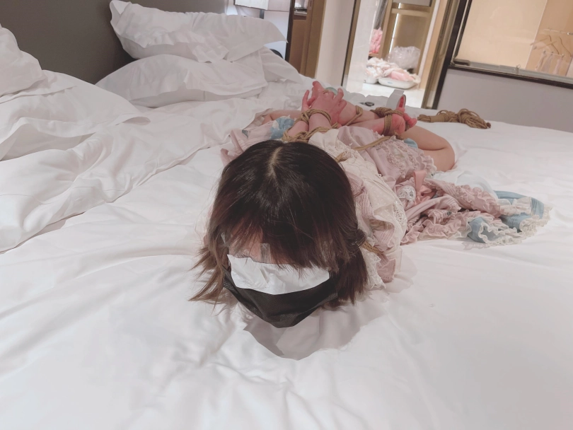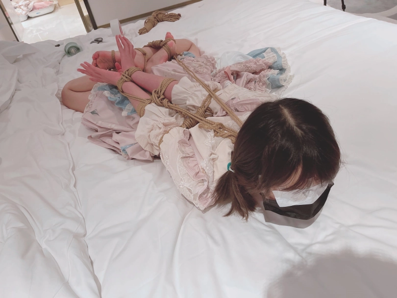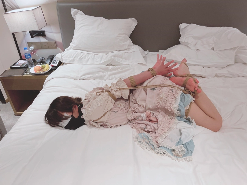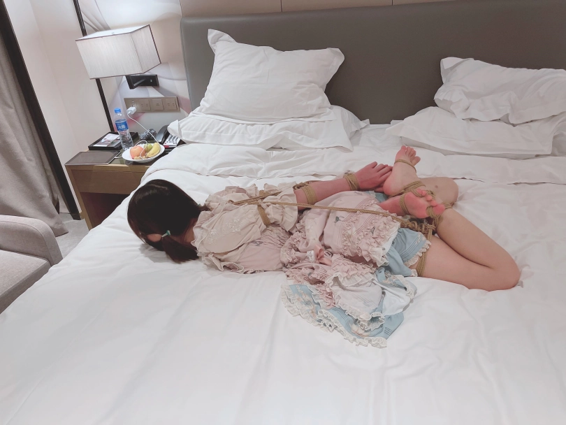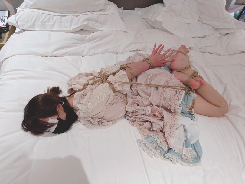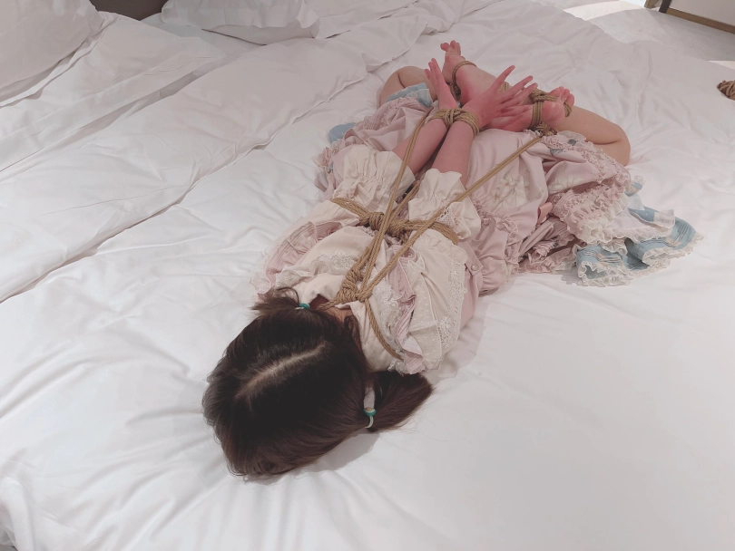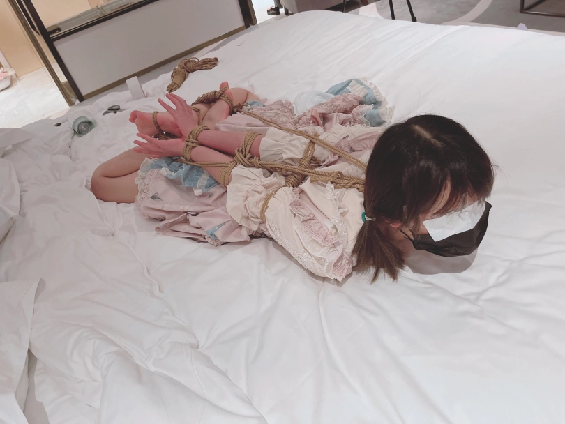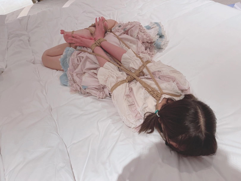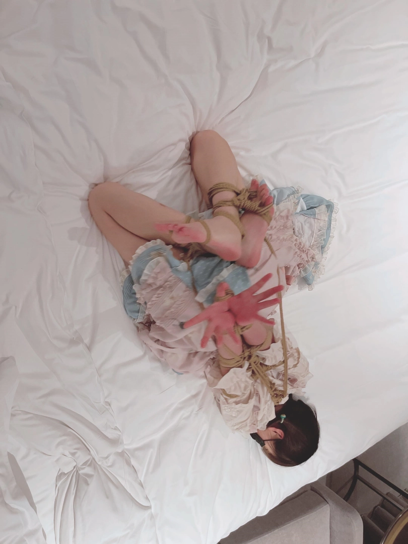 可怜的茶茶双腿几乎熔铸为一个整体,真真切切的体会到了什么叫动弹不得!直臂本就是最难以挣扎的绑法之一,盘腿驷马的支撑能力让茶茶连自己翻身都做不到,更绝望的是这次手指脚趾都被绑起来,此刻的茶茶连动动手指脚趾都成了奢望。一个活泼可爱的少女就这样被绳子连接成了一个整体,真真正正的和物品一样,只能趴在原地挣扎,连一厘米的移动都别想做到了。