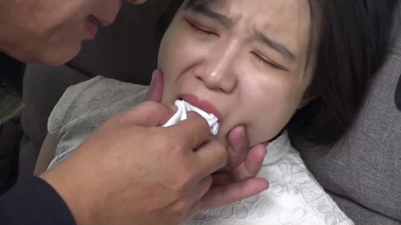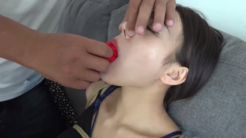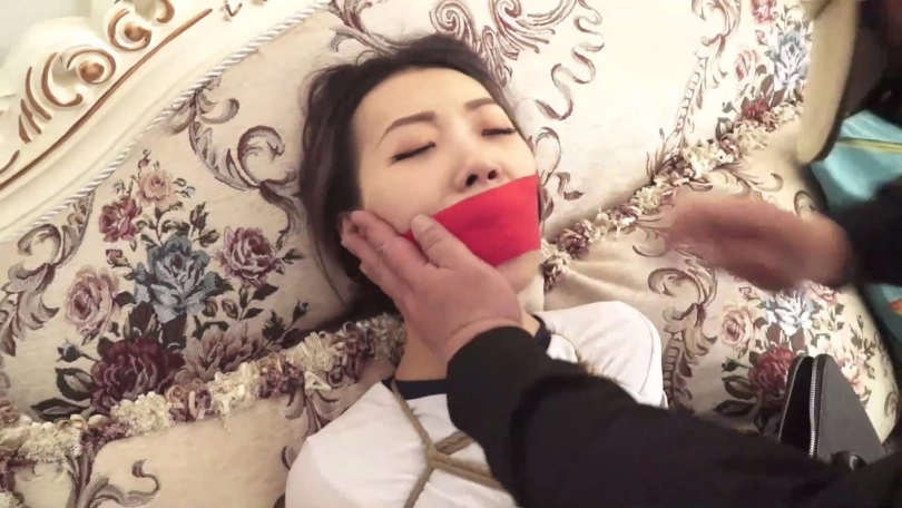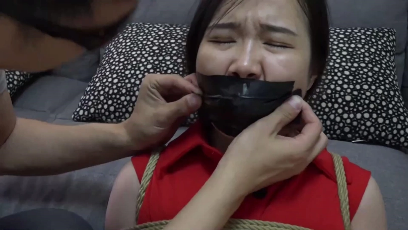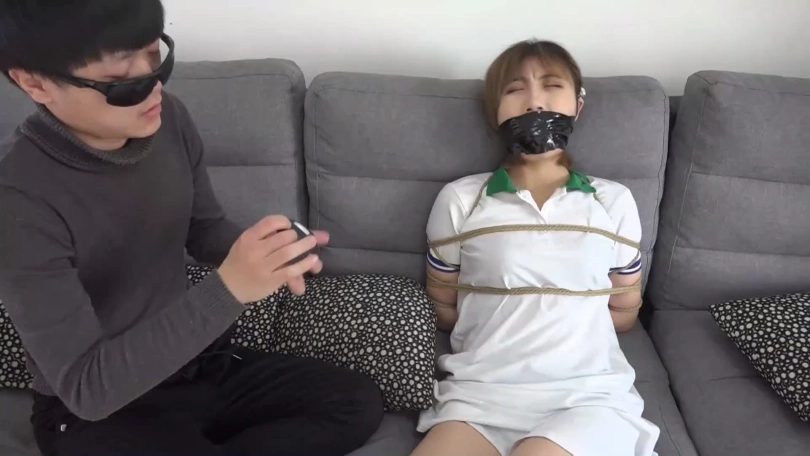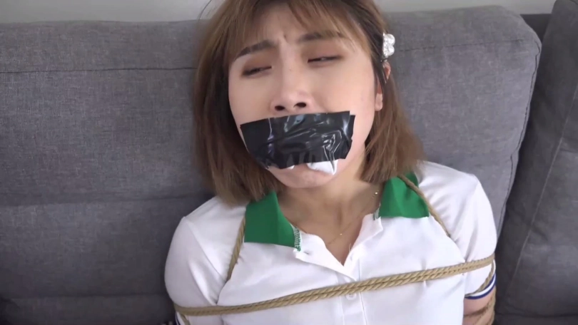 片段2:模特小雨被自己腿上穿的一条灰色连裤丝袜塞嘴,嘴巴被黑色静电胶带缠绕封住。
