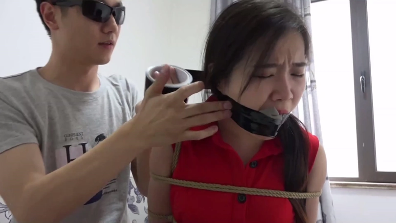片段8:模特林艺被自己穿过还没洗的一条红色脏内裤和脚上脱掉的两只肉色短丝袜塞满嘴,嘴外被黑色静电胶带缠绕封住。