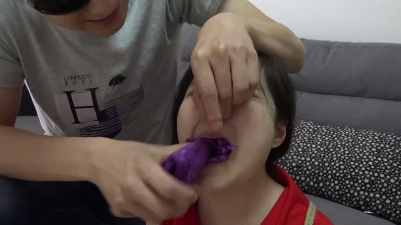 片段7:模特小雨被自己穿过的一条还没洗的紫色脏内裤塞满嘴,嘴外被黑色电工胶布封住,嘴外缠绕黑色静电胶带与黑色弹力自粘绷带。