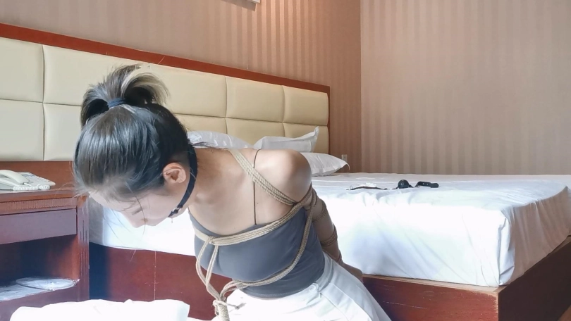 舞蹈生小松,以前没发现小松身材这么好,这身小吊带真的是把好身材都给显出来了,把小松直臂紧缚跪在地上,身前加一道绳子牵引,如果小松想直起腰来就得忍受绳子勒紧丰满的胸部,最后再给她戴上一个大号口环,放置在宾馆里,小松本来口水就挺多,在大口环的作用下口水哗啦啦的往下流,把裙子都打湿了。