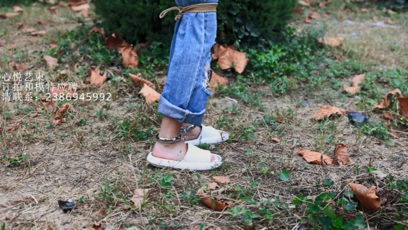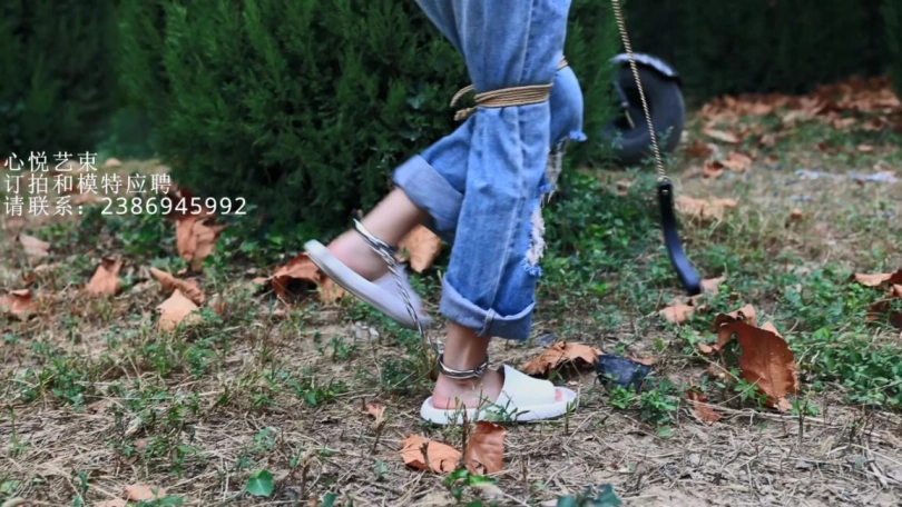 脚上戴着仅有10cm的镣铐在野外行走,最后又被我绑在树上挠痒痒。以前也就在绳艺小说里面经常看到的情节,中间来的几波人增加了几波刺激。