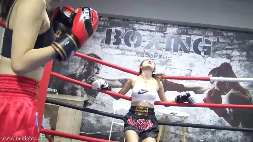 The boxing match was divided into three sets. Ling looked smaller than Xi. But she was very aggressive and flexible. Xi was calm. They seemed to be on a par. They clinched many times to defuse each other`s attacks