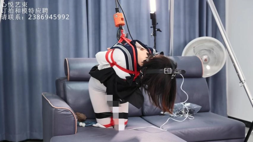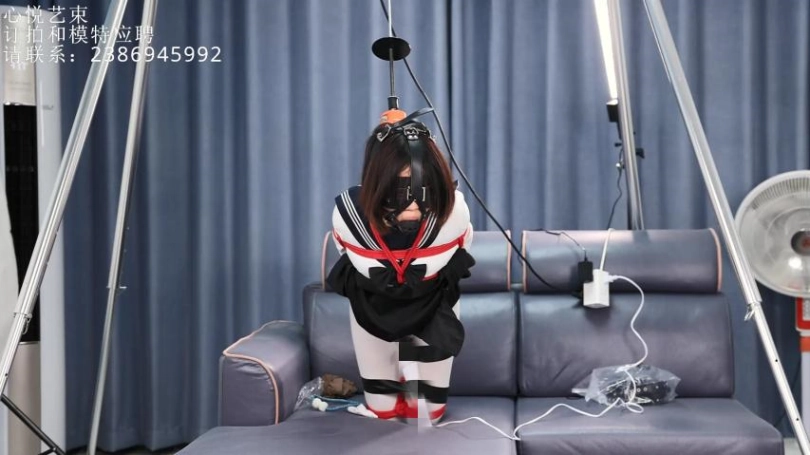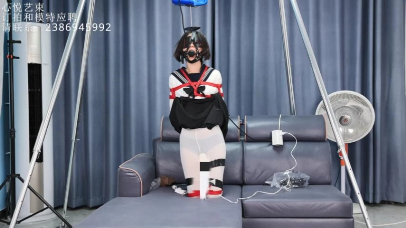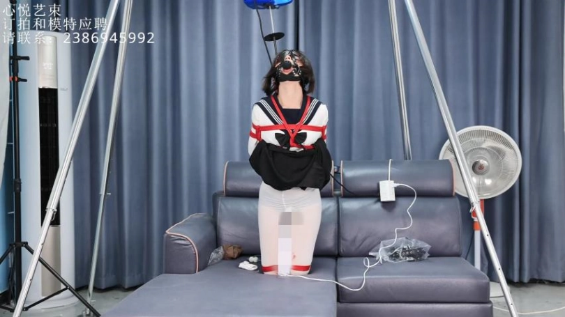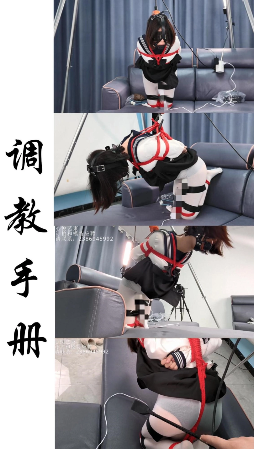 【心悦艺束】jk小萝莉的调教手册。灵感来源于站内的一本小说里面描写的绳缚场景,驷马绑好再用绳子吊起来迫使m身体直立膝盖着地,再固定好棒棒的位置,带上马具口球。