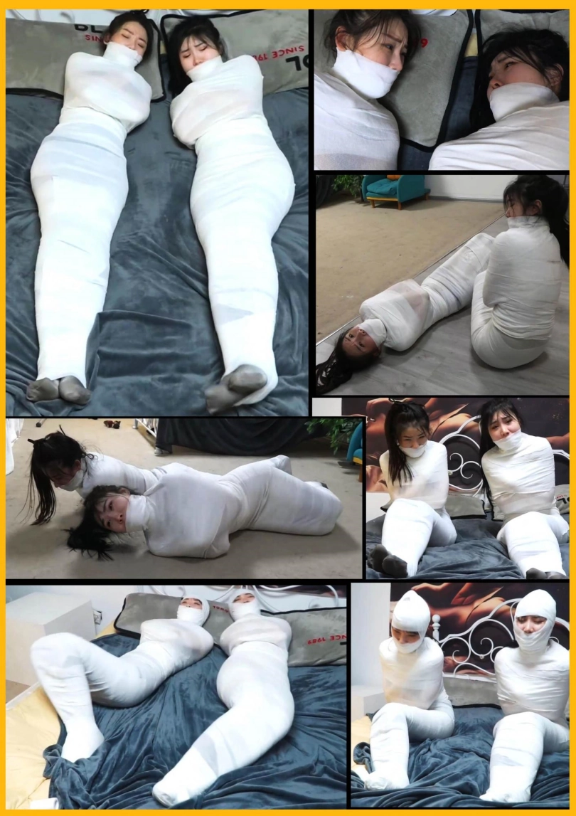 美女们彻底被洁白的绷带包裹成只露脸的木乃伊人茧,美女们只能奋力挣扎蠕动,想办法在地上爬行逃跑,但是被狱警发现,美女们连唯一的丝袜脚也被包裹,包裹的只露出可怜兮兮的眼睛。美女们彻底变成的洁白的人茧~