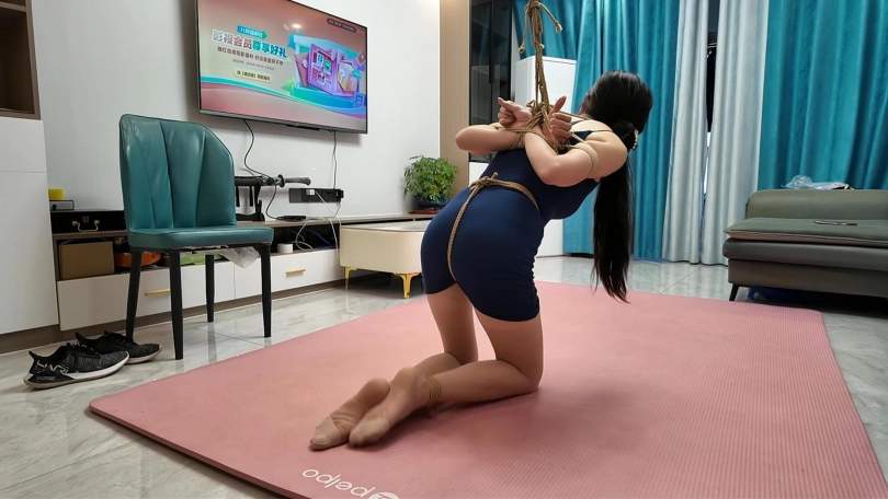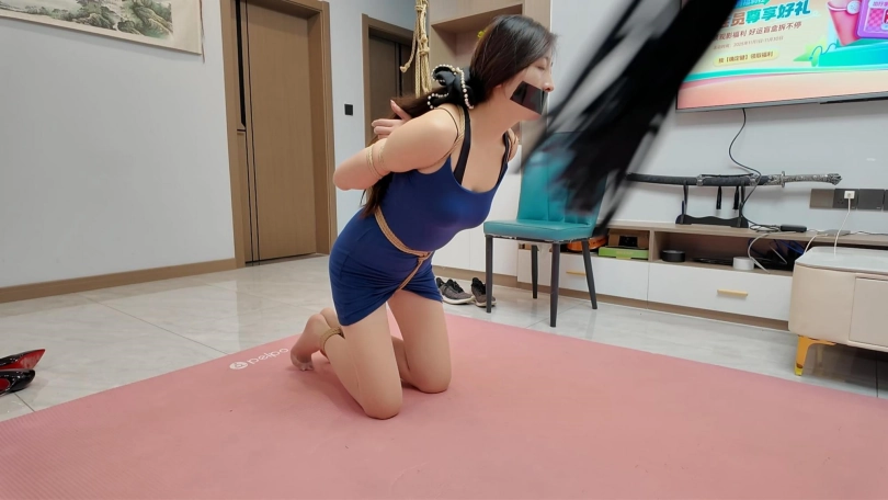 美女在沙发上玩时间,困了了休息,不料被入室神秘人捂晕,醒来已经被绑在椅子上,嘴也被堵上,拼命挣扎,从椅子上摔到地上继续挣扎,挣脱绳子刚跑到门口,就被神秘人抓回,双脚捆上,半吊在客厅折磨,从房间翻出一条性感裙子,逼迫美女穿上跳舞,最后竟然后手观音紧缚,用一条肉丝塞满美女嘴巴,又用一条肉丝蒙上眼睛,用更黑丝套头,驷马捆绑好扬长而去
