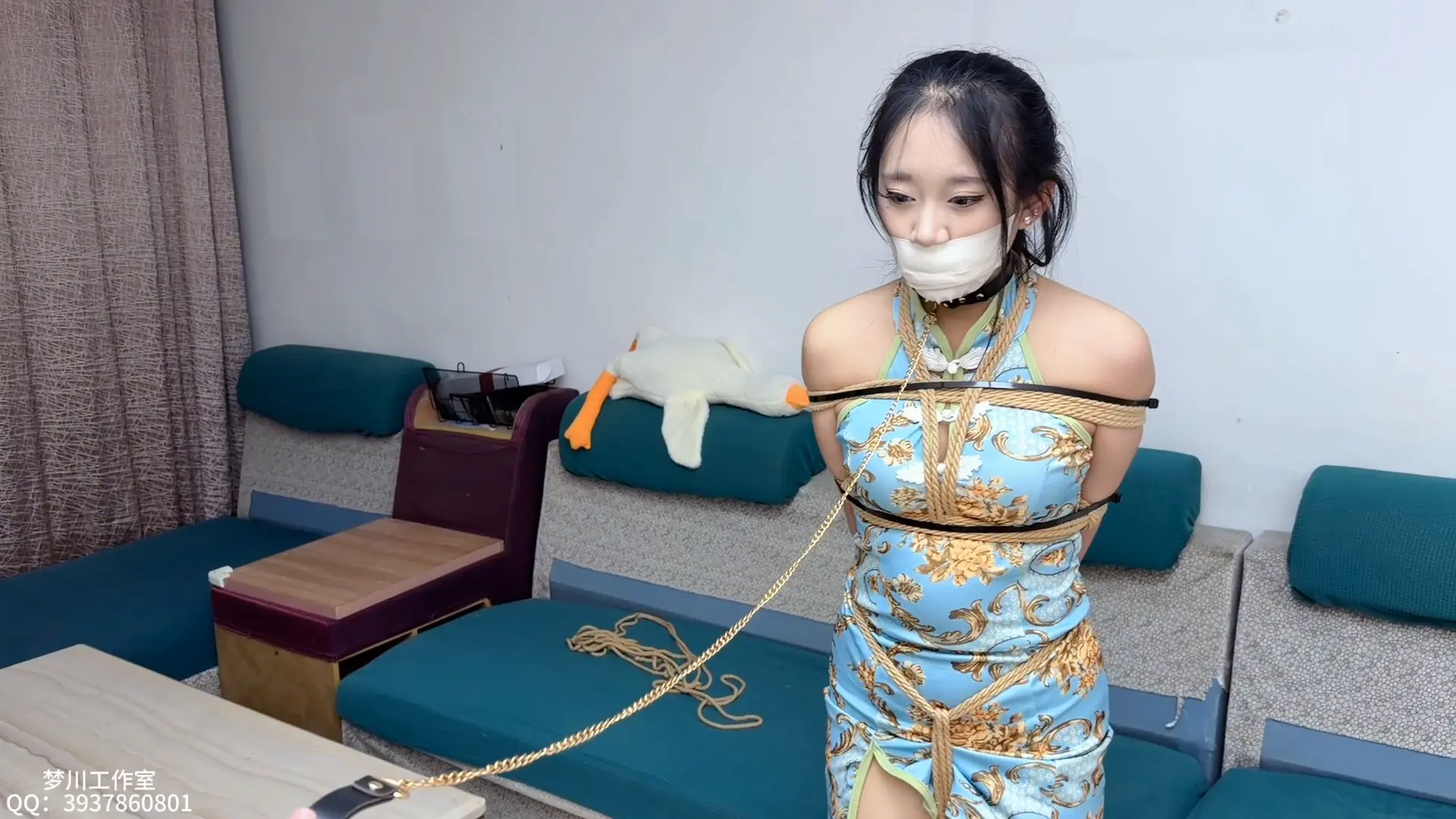 她此刻身着浅蓝色包臀旗袍,双腿包裹着肉色丝袜,