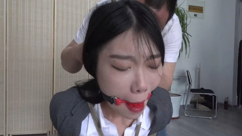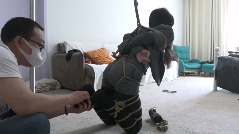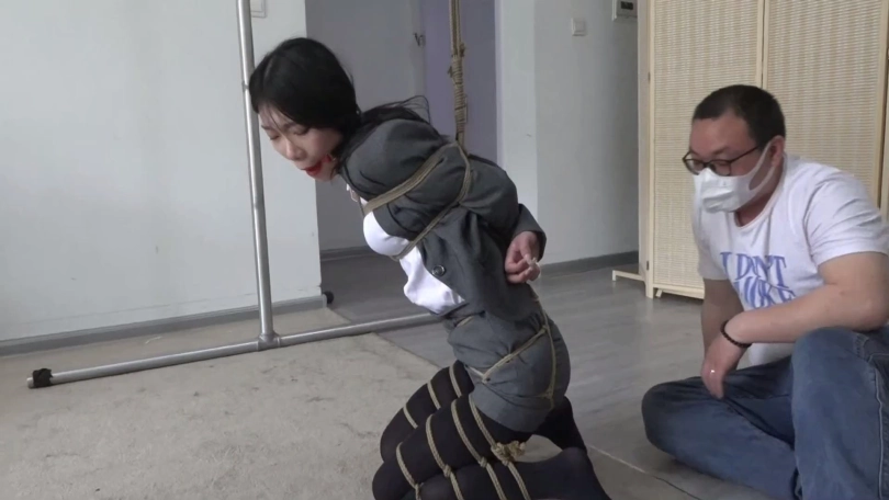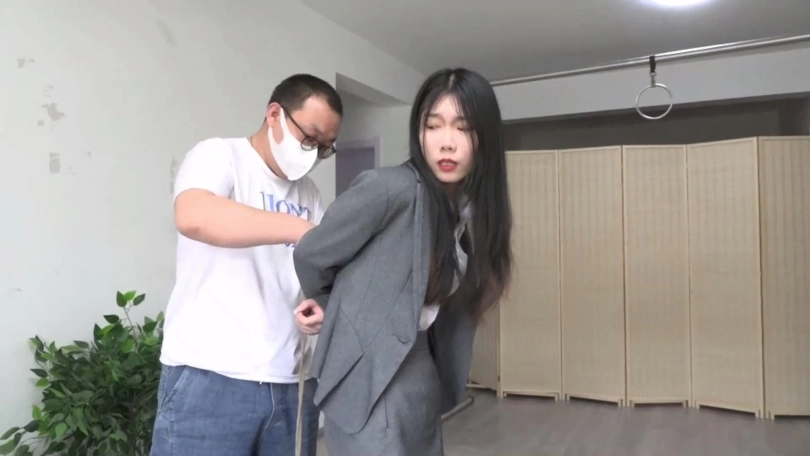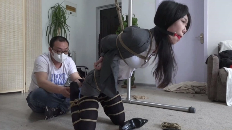 杨若影被手铐脚镣锁在了辅导员的房间内,辅导员走了进来,将杨若影捆绑起来。并威胁杨若影成为自己的奴隶,杨若影从誓死不从到最终勉强同意。(绑法如图3,服装如图4,偏厚黑丝,黑色高跟,中后期高跟脱掉,挠脚心)