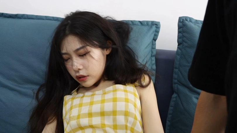 过了一会儿,男主回来了,说道:“反正你失去意识了,但是看你也没什么大碍,估计晕个几个小时就醒了,昏过去了也可以当模特嘛,没准还更性感。”然后,他掏出手机,给女孩拍特写。然后,又把女孩拉到沙发上侧躺着,但是脚还在地上。然后男主又继续给女主拍照。男主又让女主躺在沙发上,摆成十指相扣的睡美人,继续给她拍照。然后又把女孩翻了个身,背部朝上躺在沙发上,说道:“这个姿势迷人!”拍了张照片。(这个期间,镜头给女主要更多,男主在一旁拍照是次要的。)说着把女主抱到沙发上,给女主摆了几个性感的姿势拍照。然拍完后,工作结束了。女孩还是昏迷不醒。男主让她躺在沙发上,不停的玩弄着她的手、腿和脚,并且玩自由落体。男主又坐在沙发上,把女主搂到自己怀里,让她坐在自己的腿上,开始摆弄她软绵绵的身体和双手,非常快活。然后,男主调转女主的身体,让她的头枕在自己的腿上,身体躺在沙发上。男主拍打着女主的脸,又不停的掀开她的眼睛,亲吻她的双手。这时候电话又响了,男主一脸不爽地去接电话,离开镜头。走之前让女孩平躺在沙发上。(镜头拉近,把女孩从脸、到手、到腿、到脚近距离特写,来回几遍,三分钟左右。)
