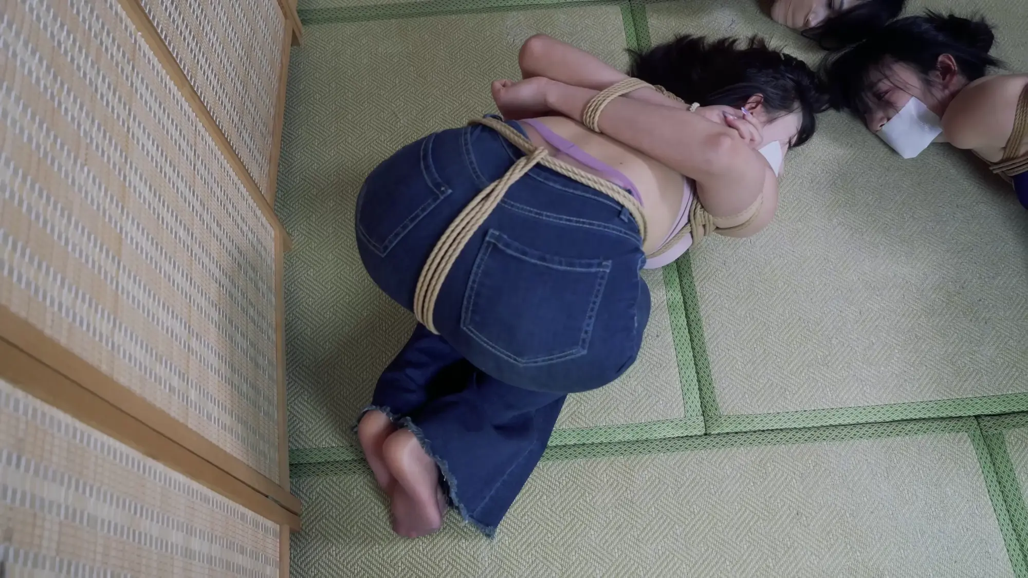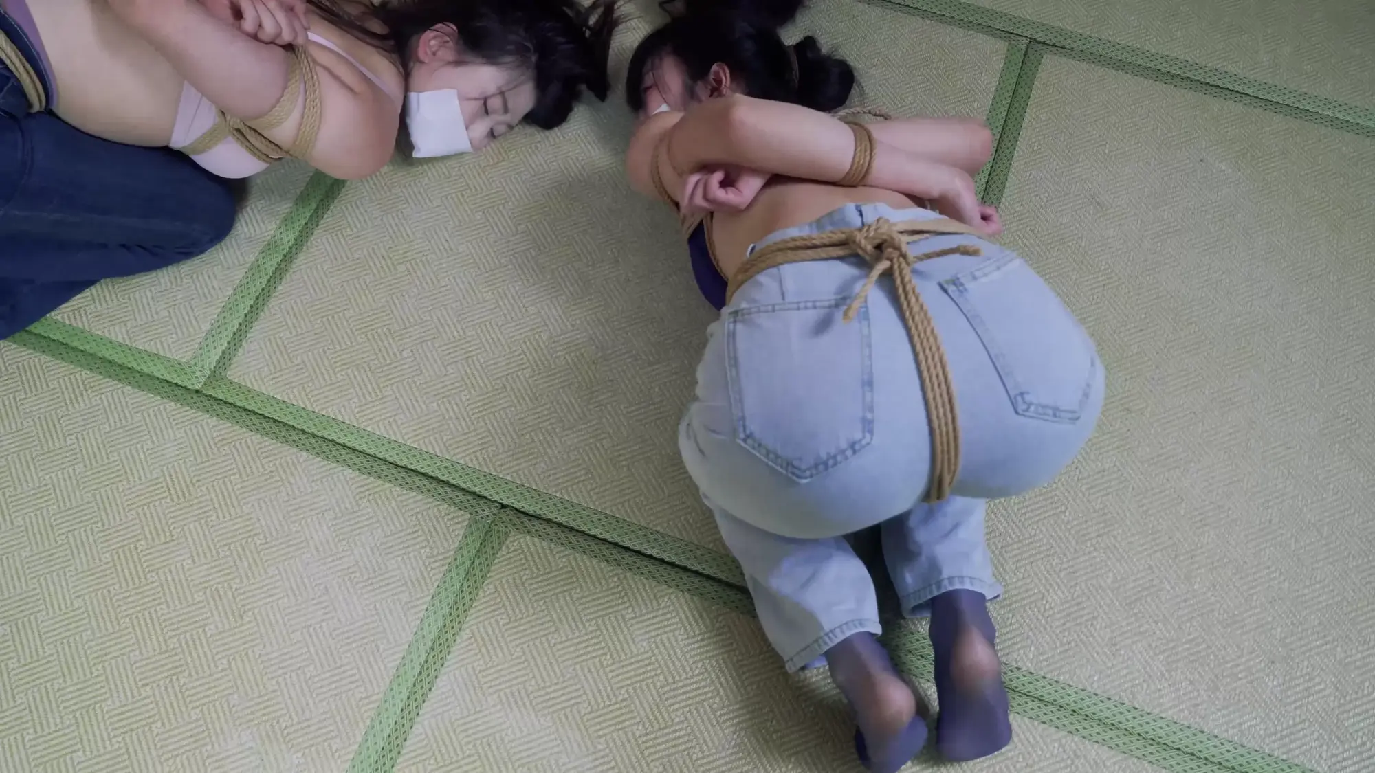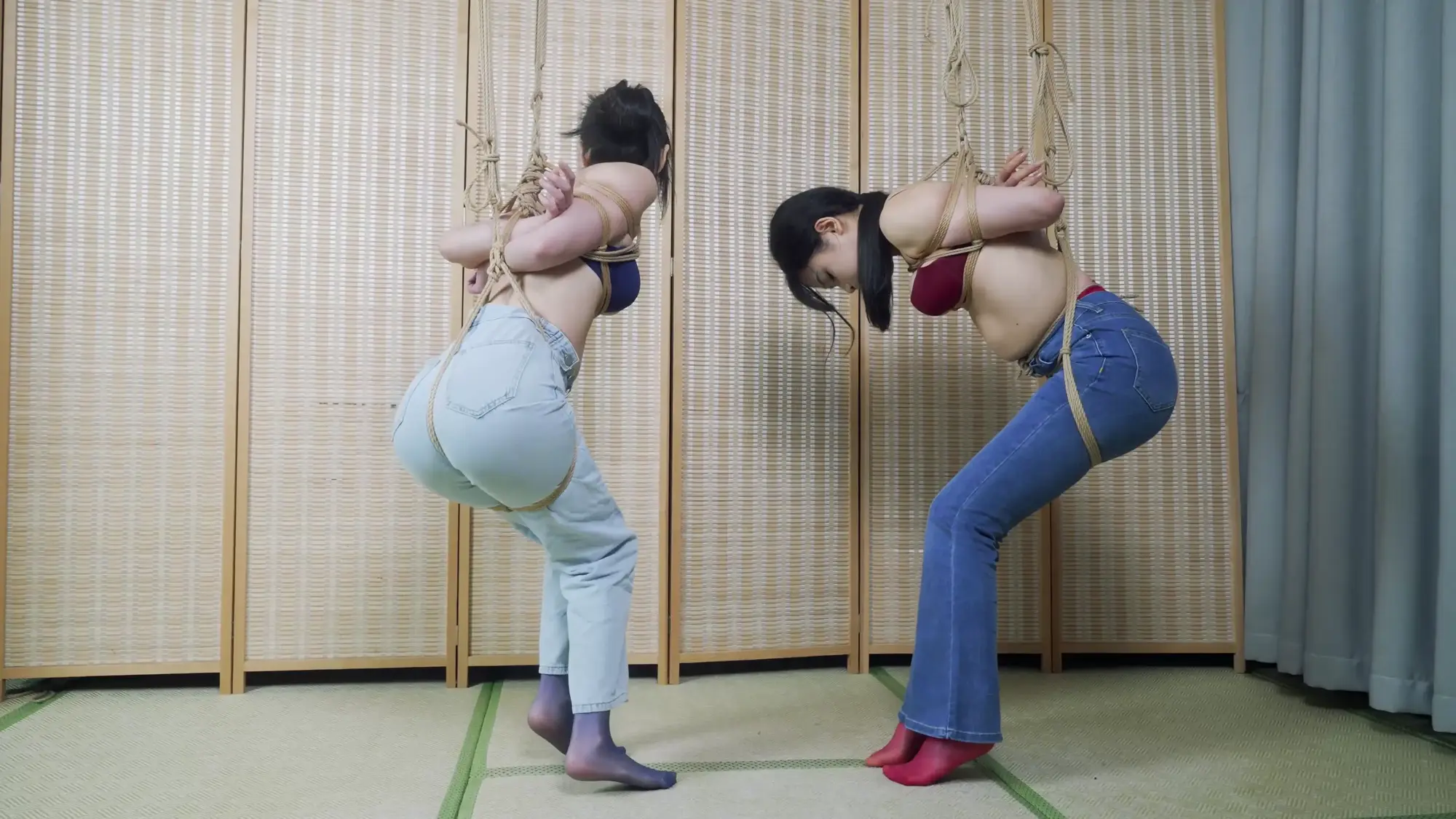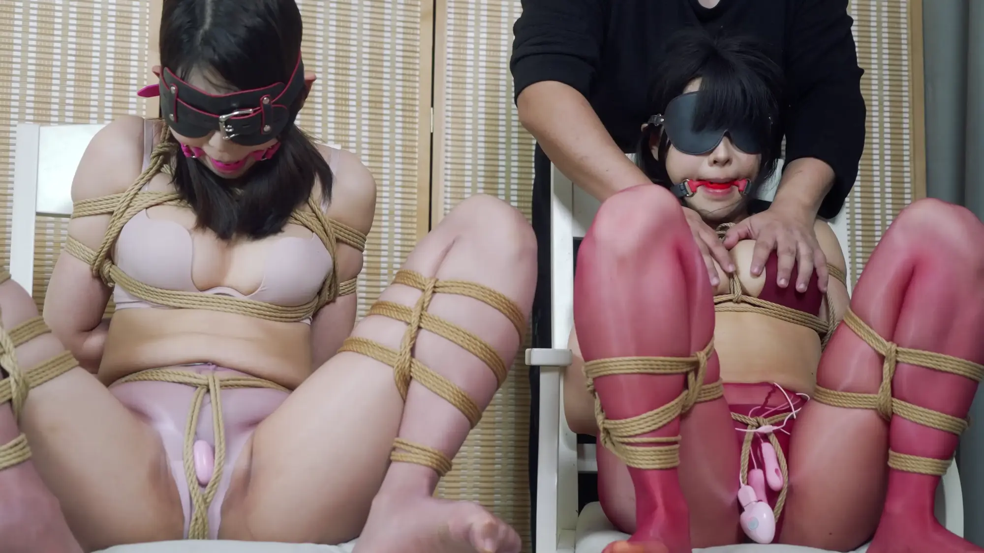 第一环:先把嗷嗷小0坐绳吊缚,叫上花花一起玩弄她们两人;
